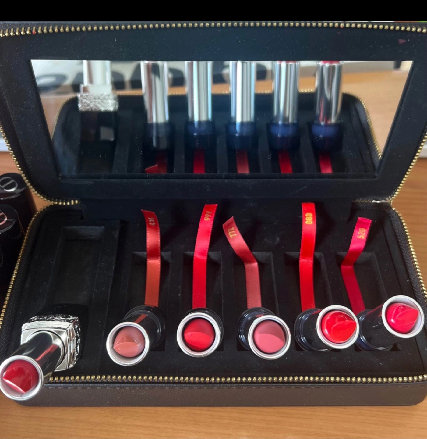Gorgeous Dior holiday makeup set. Includes a stylish black zip-around case with a mirror. Five mini lipsticks in various shades. Perfect gift or treat for yourself.