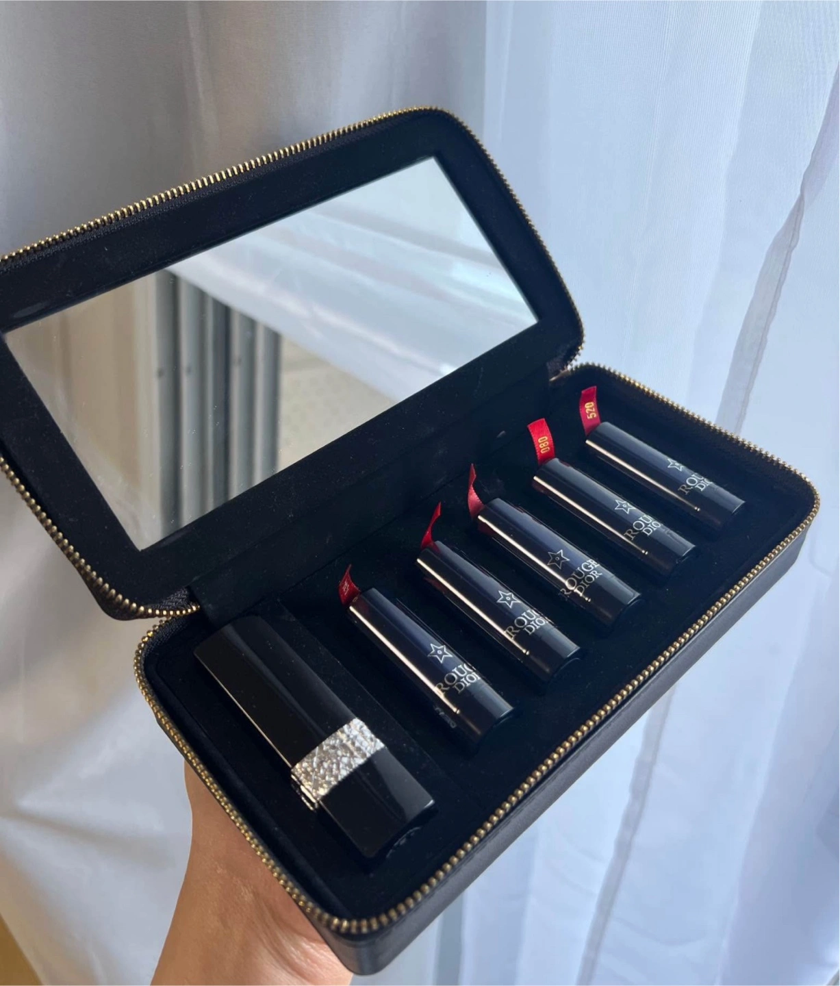 Gorgeous Dior holiday makeup set. Includes a stylish black zip-around case with a mirror. Five mini lipsticks in various shades. Perfect gift or treat for yourself.