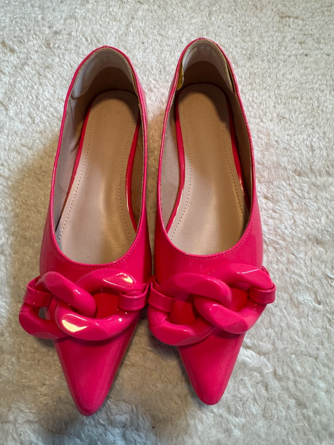 These stylish hot pink ballet flats feature a chic oversized chain embellishment on the toe. They have a pointed toe and a comfortable flat sole. The shoe material appears to be a glossy patent finish.