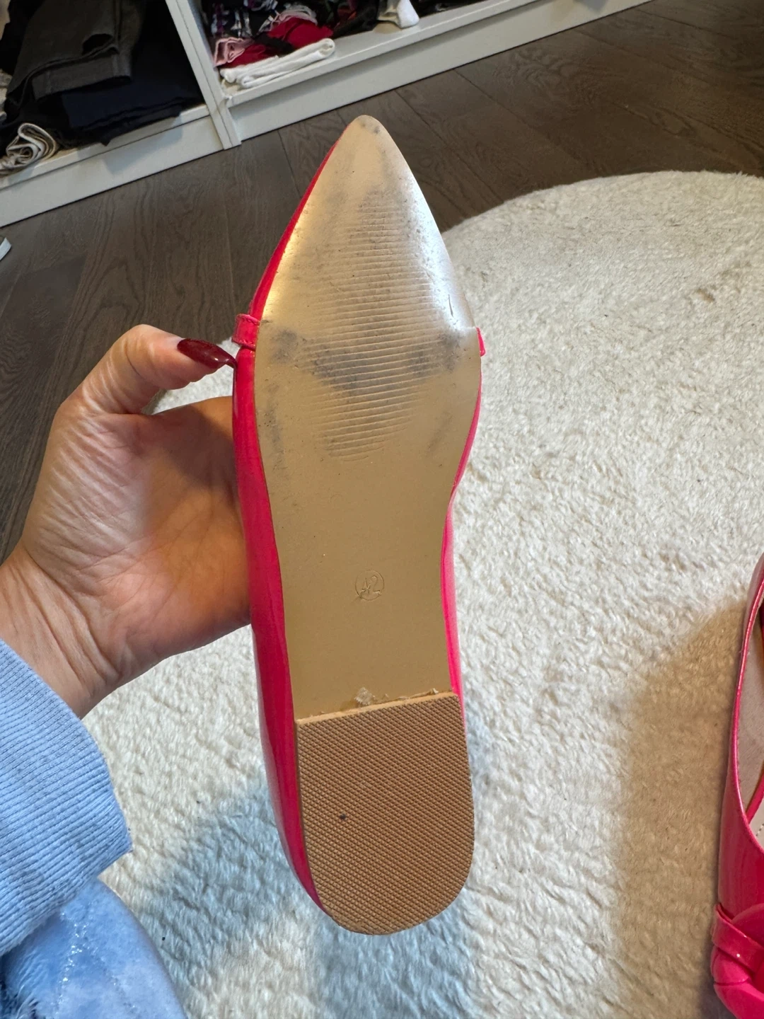 These stylish hot pink ballet flats feature a chic oversized chain embellishment on the toe. They have a pointed toe and a comfortable flat sole. The shoe material appears to be a glossy patent finish.