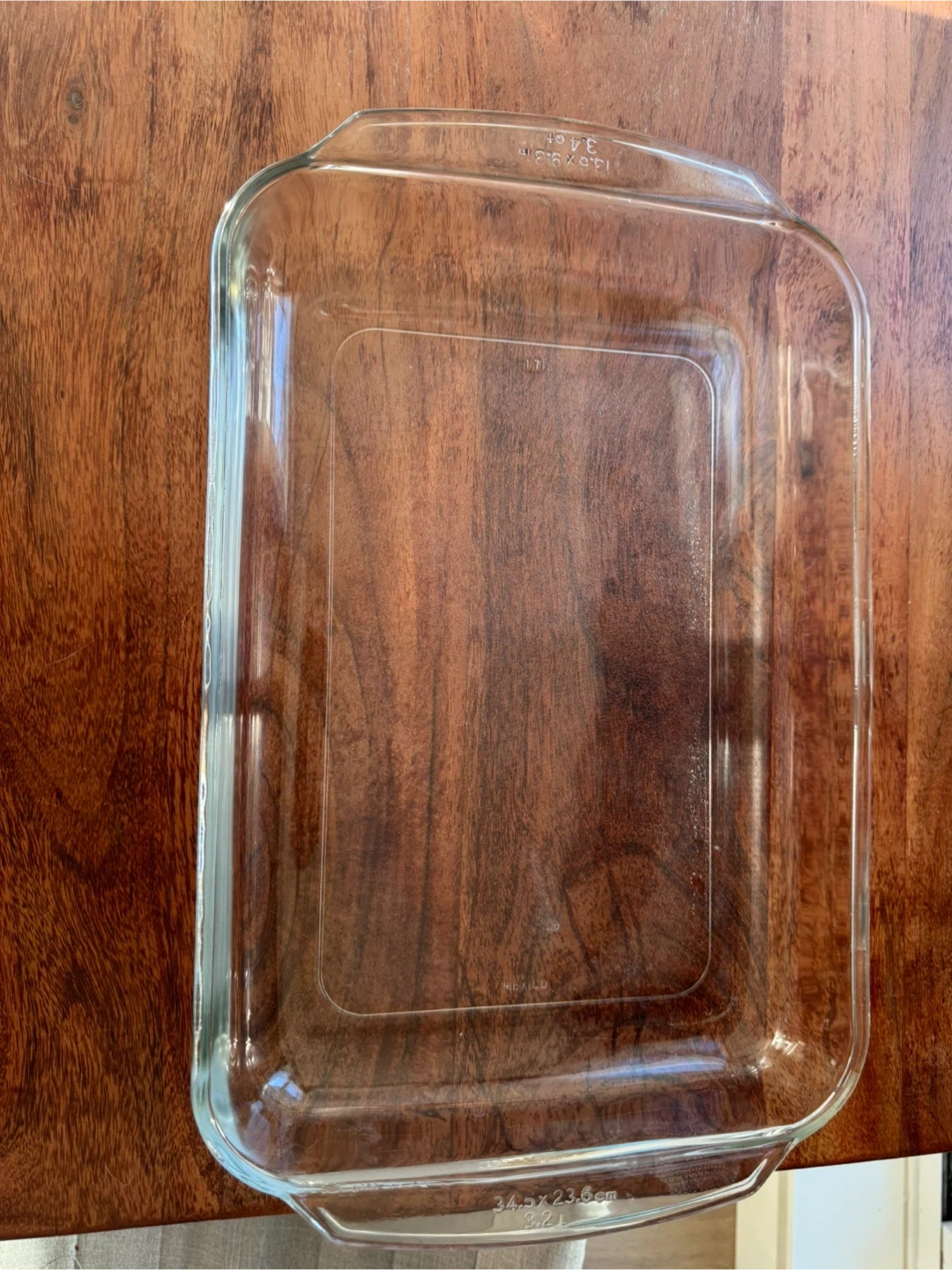 This is a Pyrex 3.4 quart glass baking dish. It measures 13.25 inches by 9.3 inches. Dishwasher safe.