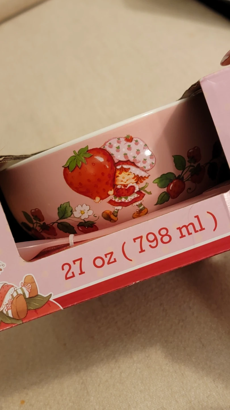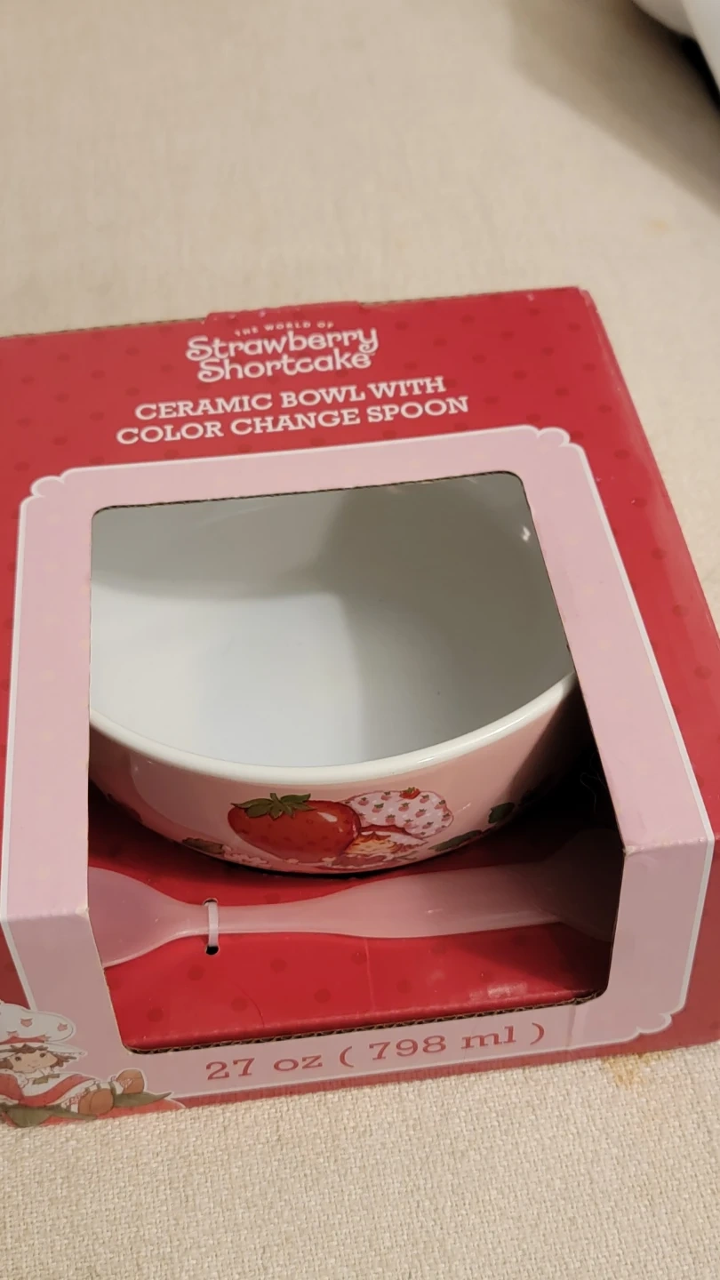 This is a 27 oz (798 ml) ceramic bowl featuring Strawberry Shortcake. It comes with a color-changing spoon. It's a cute addition for fans of the character!