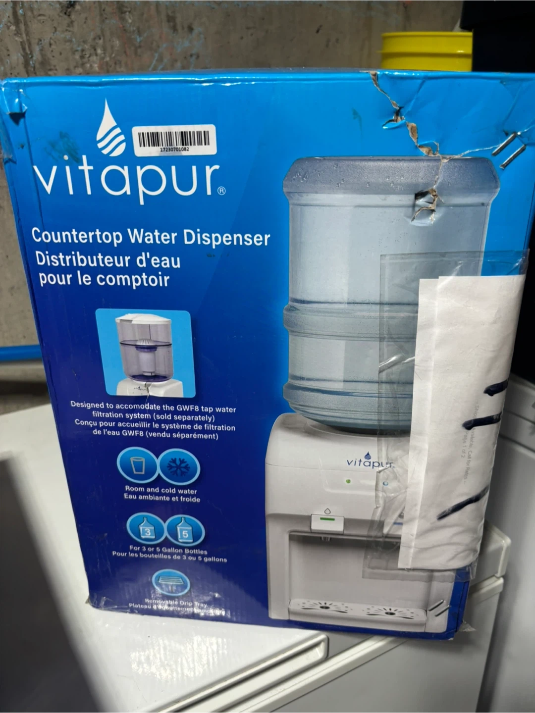 This Vitapur countertop water dispenser provides both room and cold water. It's designed to accommodate 3 or 5-gallon bottles. Features a removable drip tray.