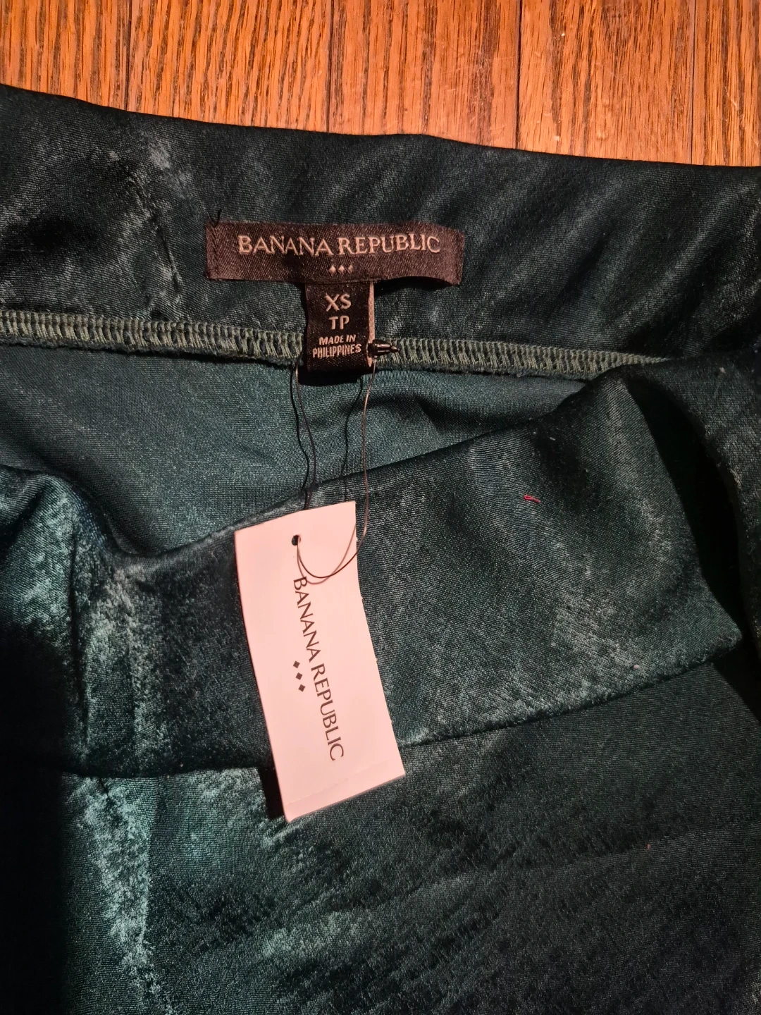This is a Banana Republic satin skirt in a size XS. It's a lovely deep green colour. This skirt's material is satin with an elastic waistband. It would be great for dressing up or down! Brand new with tags.