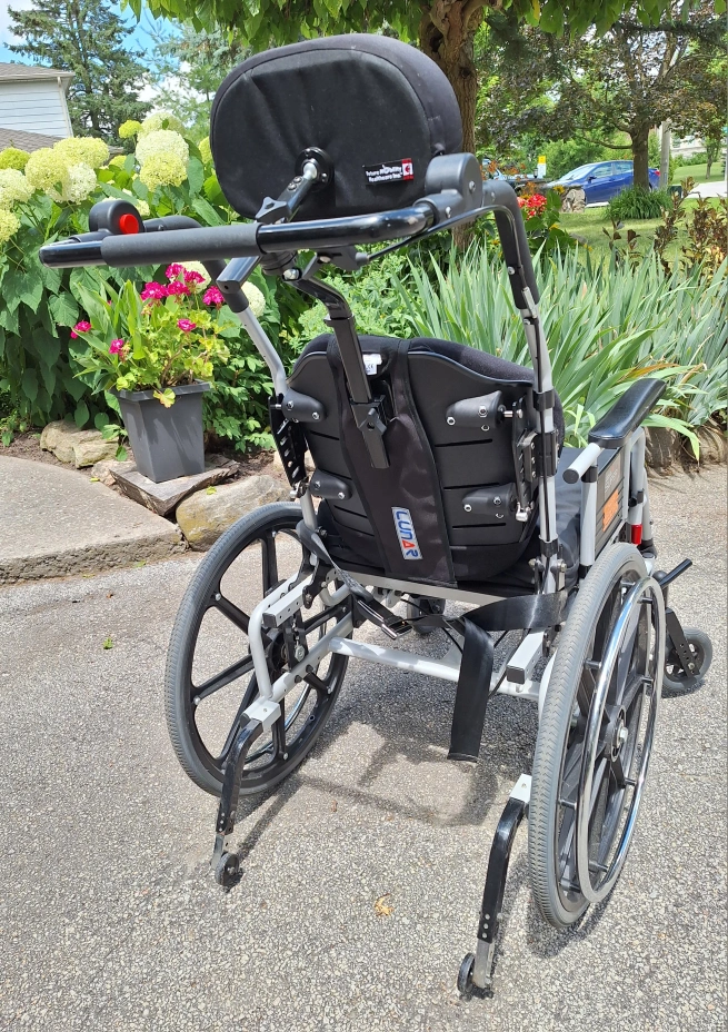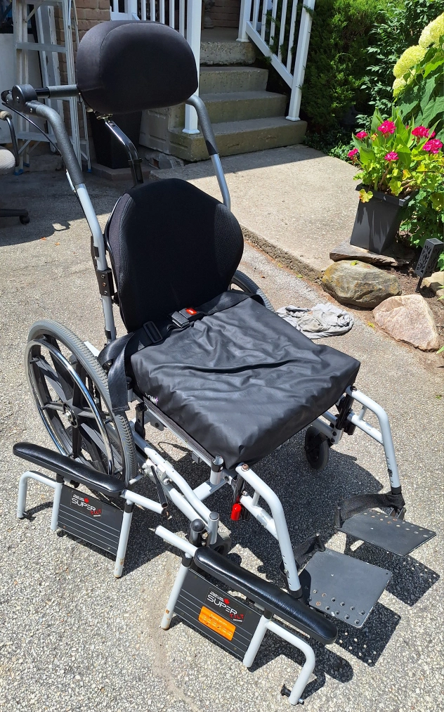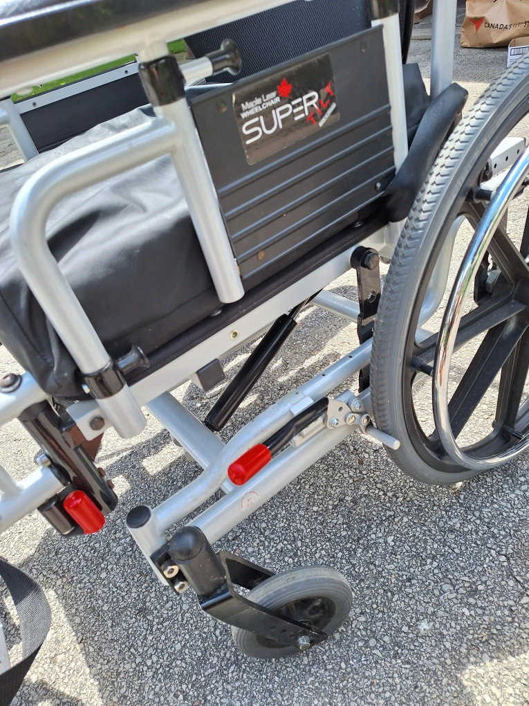 Maple Leaf Super Tilt Wheelchair with head and arm rests. Heavy duty low rider with inflatable seat cushion (no cover). Made in Canada 2018, mint condition very smooth tilt and rides like new. Please see pictures and manufacturer specs for more details.
