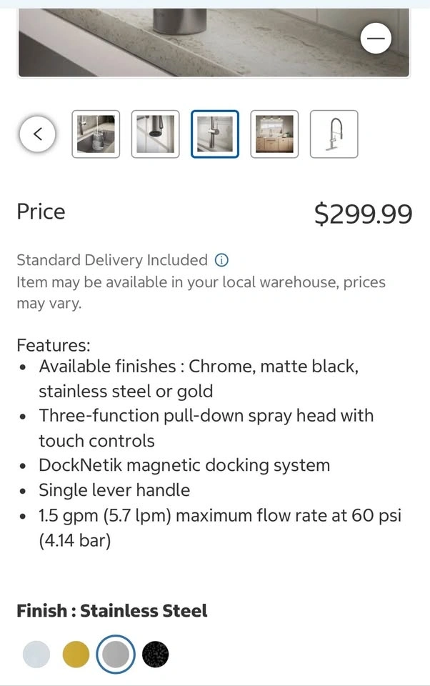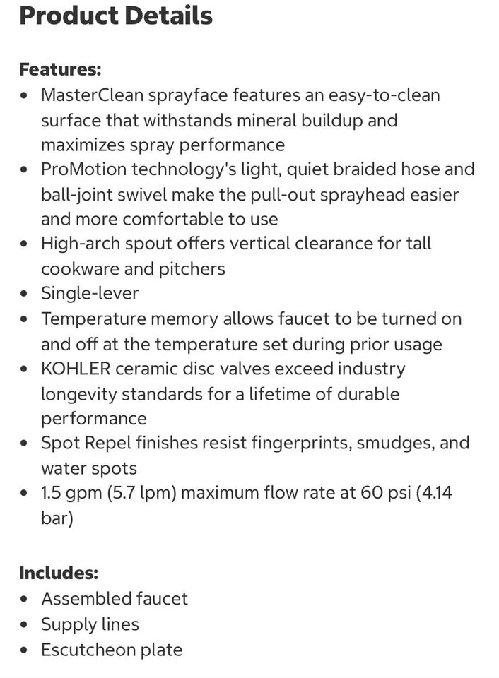 Brand New in a Box. Three-function pull-down spray head with touch controls. DockNetik magnetic docking system. Single lever handle. 1.5 gpm (5.7 lpm) maximum flow rate at 60 psi (4.14 bar).