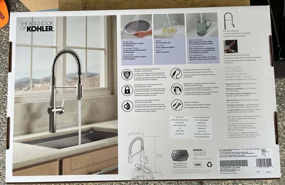Brand New in a Box. Three-function pull-down spray head with touch controls. DockNetik magnetic docking system. Single lever handle. 1.5 gpm (5.7 lpm) maximum flow rate at 60 psi (4.14 bar).
