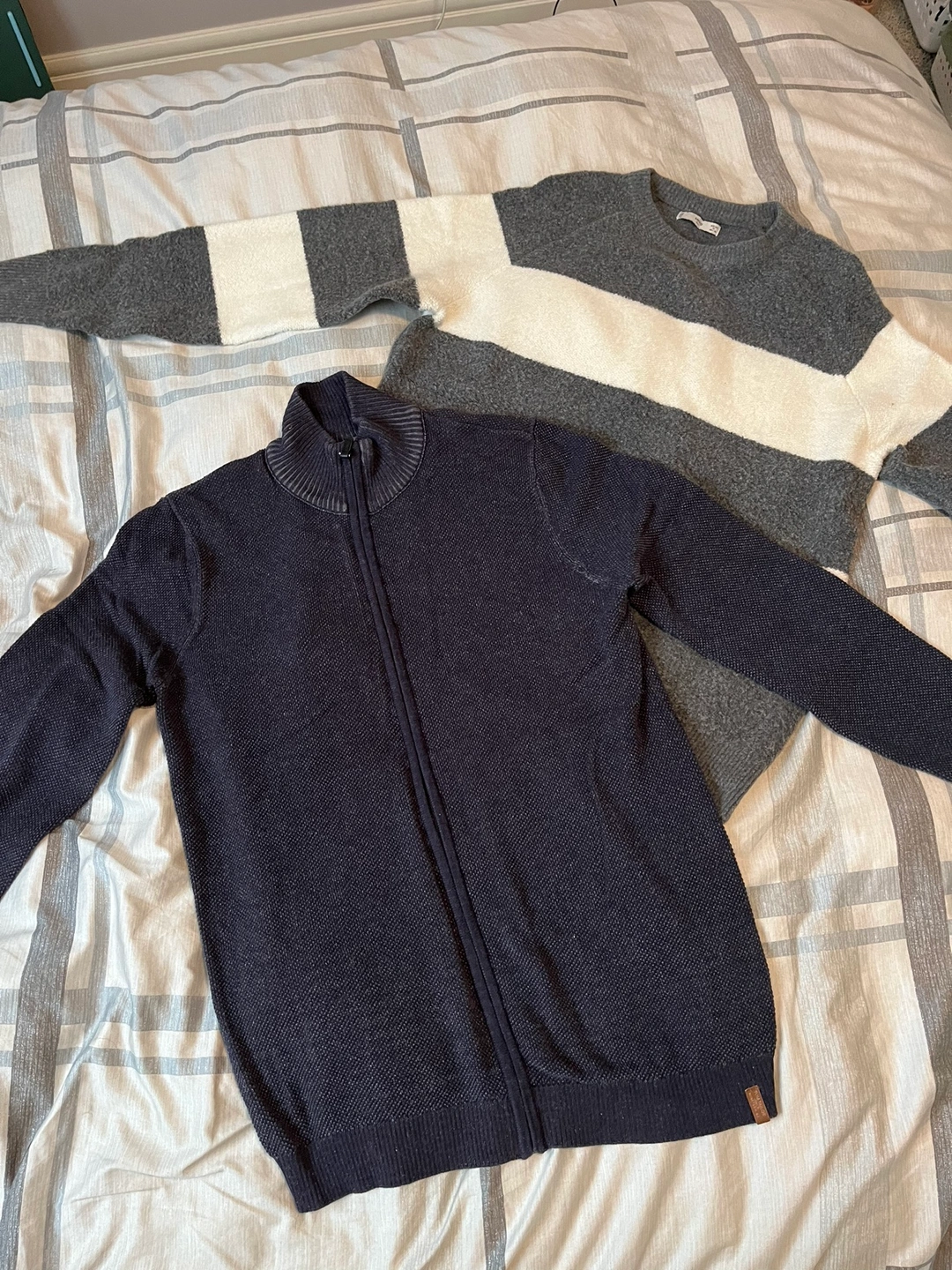 Dark blue zip-up sweater. The sweater has a textured pattern and a high collar. It is a long-sleeved sweater with two pockets on the front.