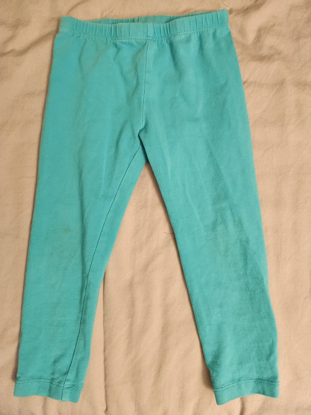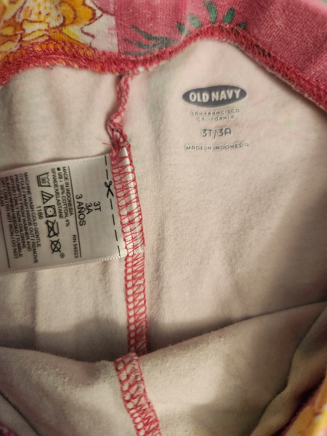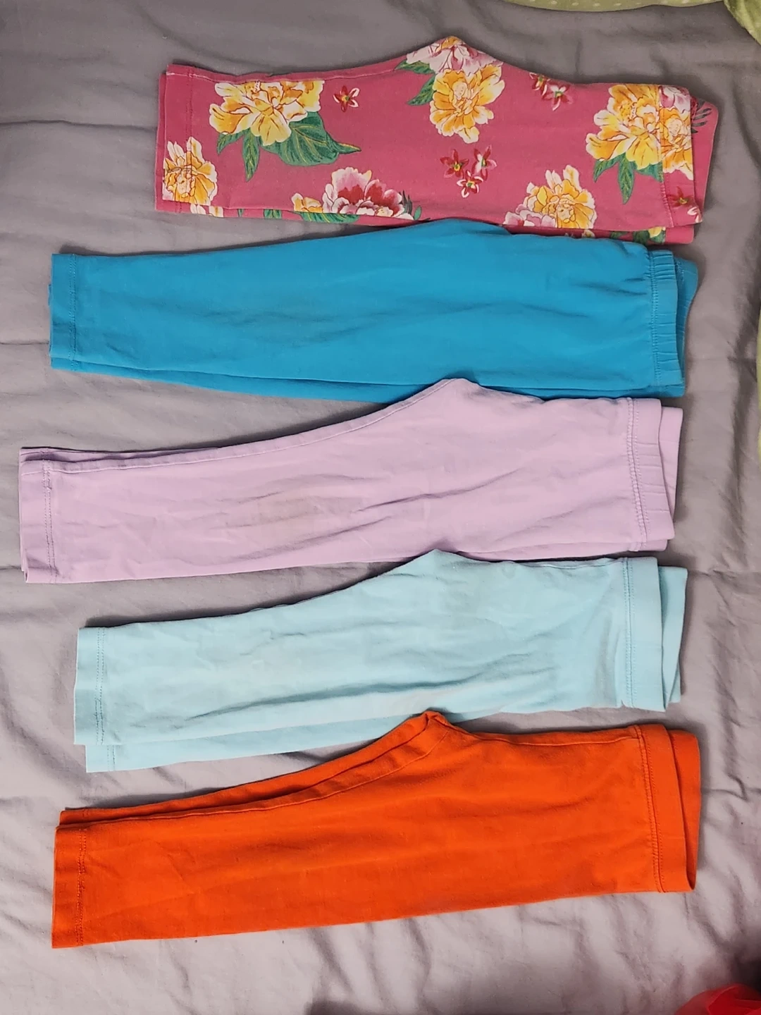 Bundle of five pairs of kids' leggings in size 3T and 2T. Includes one floral print pair from Old Navy and four solid coloured pairs.