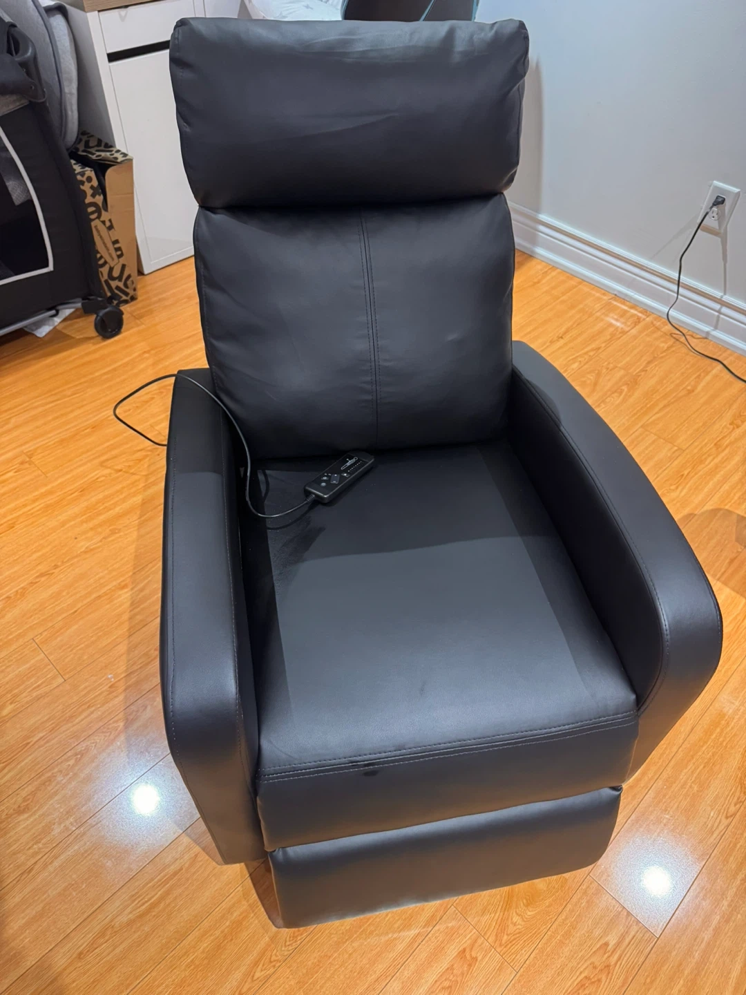 This is a comfortable black faux leather recliner chair. It has a remote control for adjustments. The chair reclines fully and has a footrest. It's a great addition to any living room!