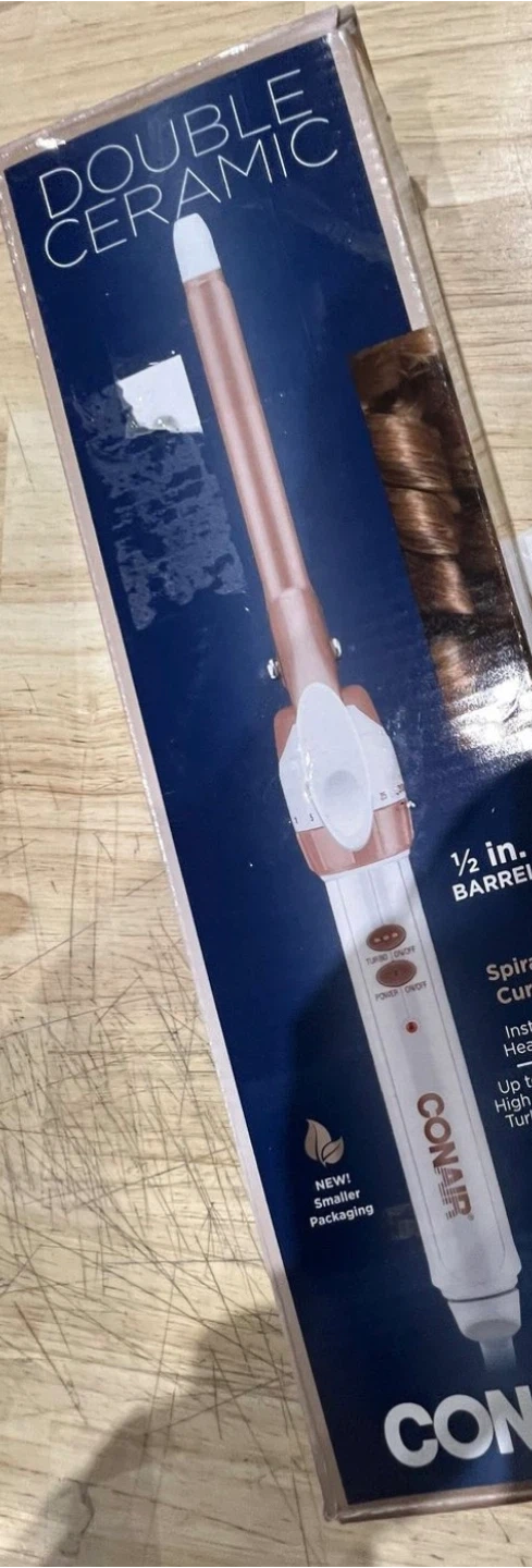 New, This Conair curling iron has a 1/2 inch barrel with double ceramic technology. It offers instant heat and a turbo setting for high heat curling. It comes in its original packaging.