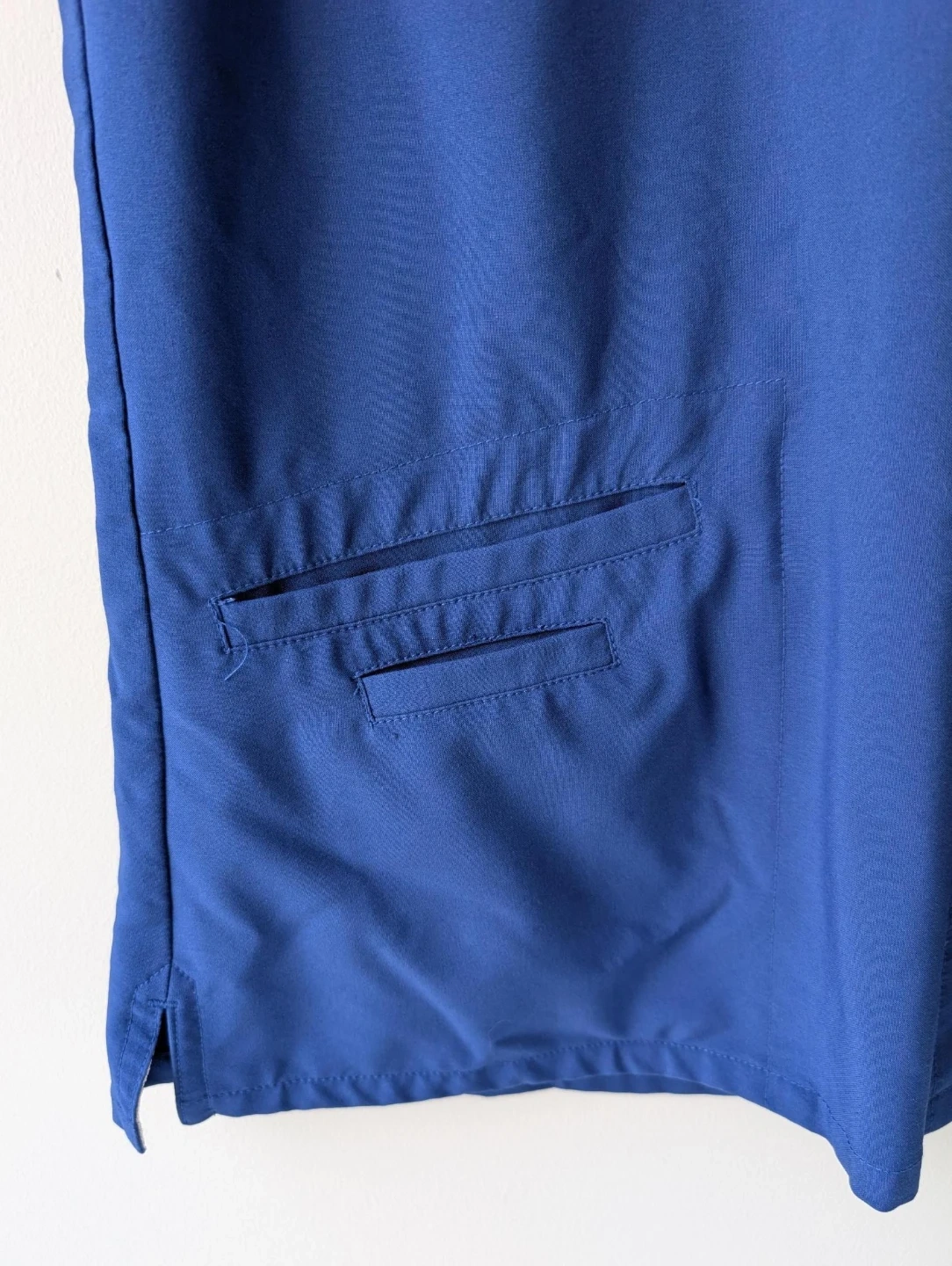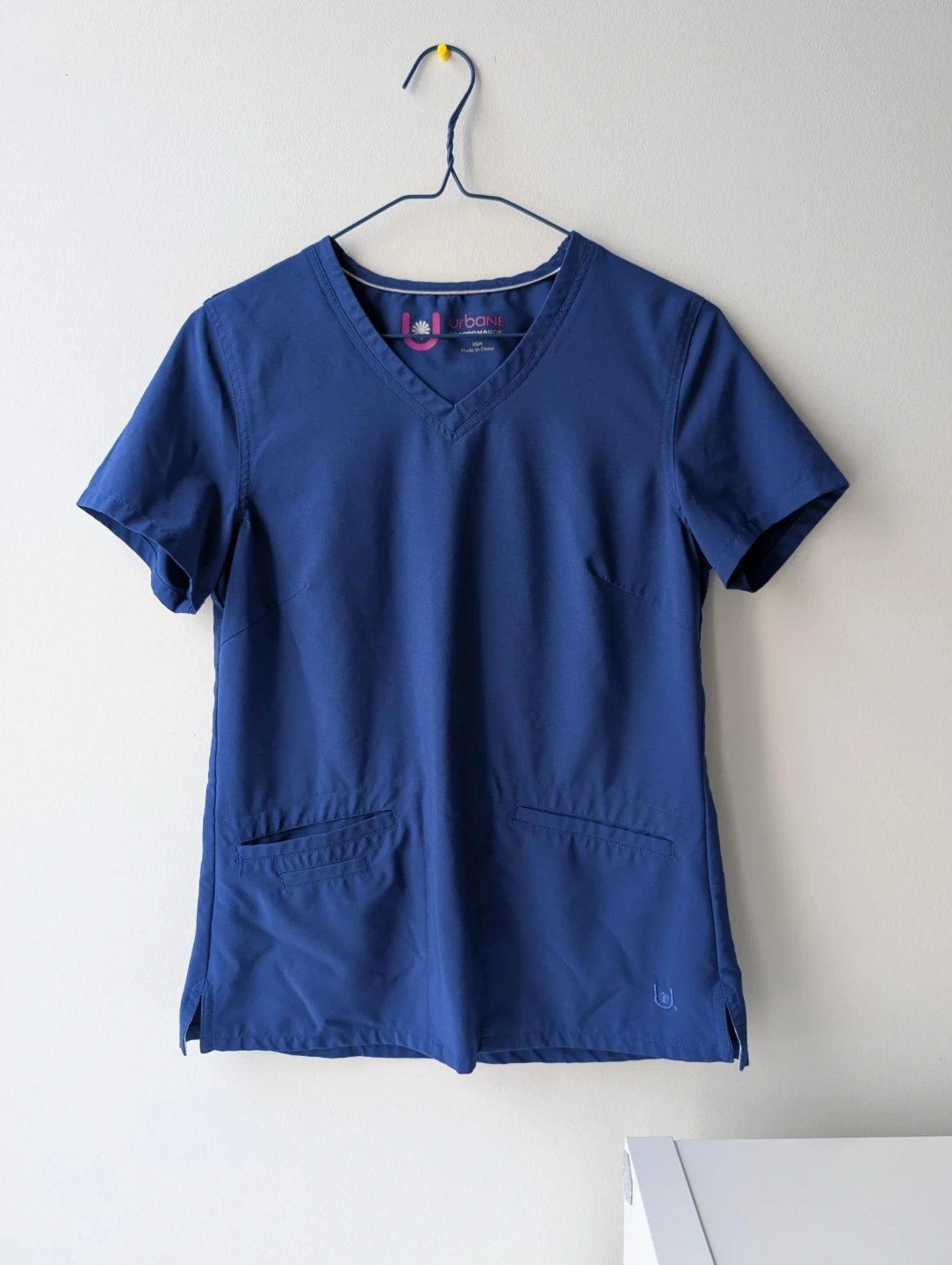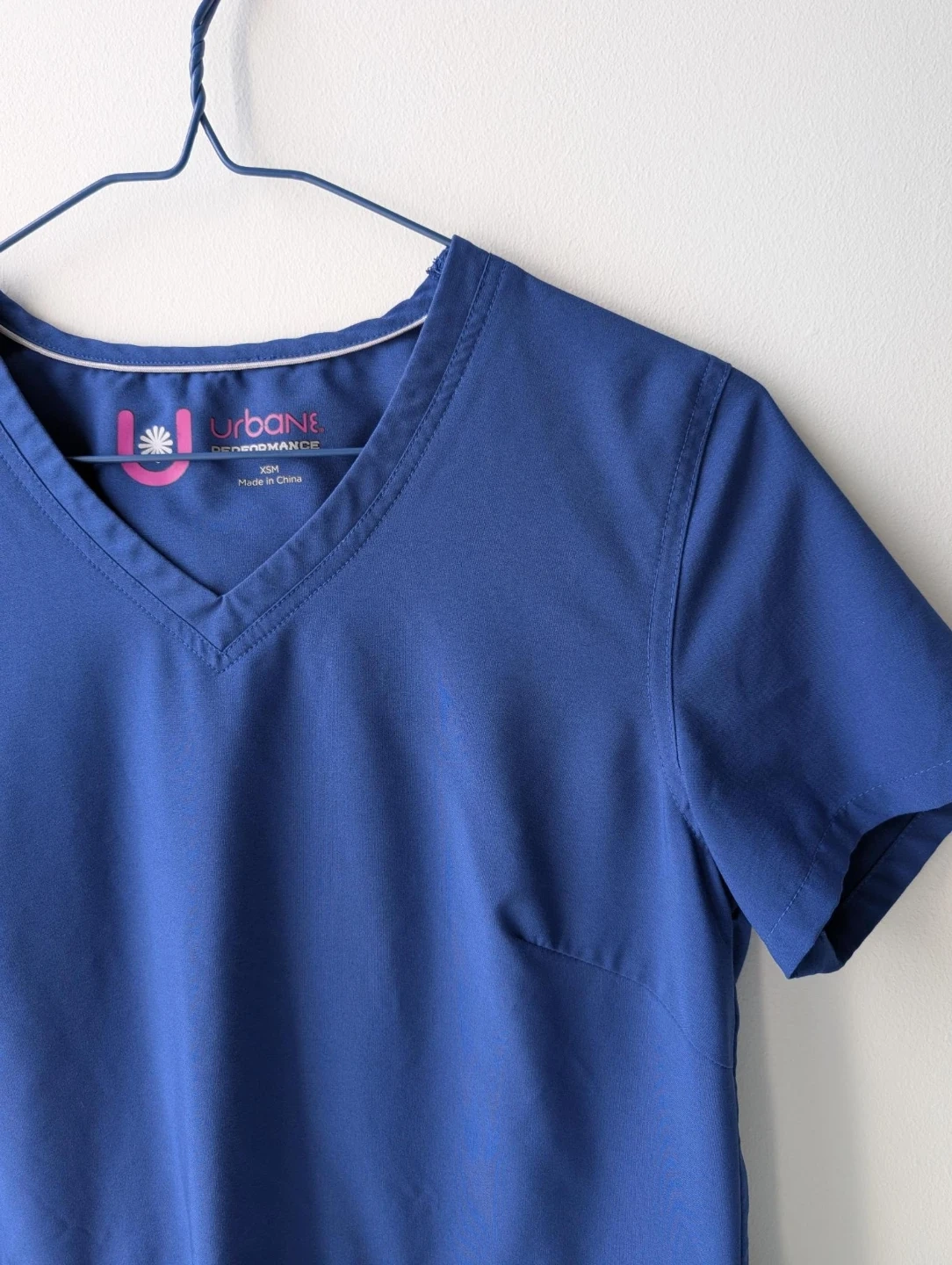 This is a blue Urbane Performance scrub top. It's a size XSM. It features two front pockets and a small chest pocket.