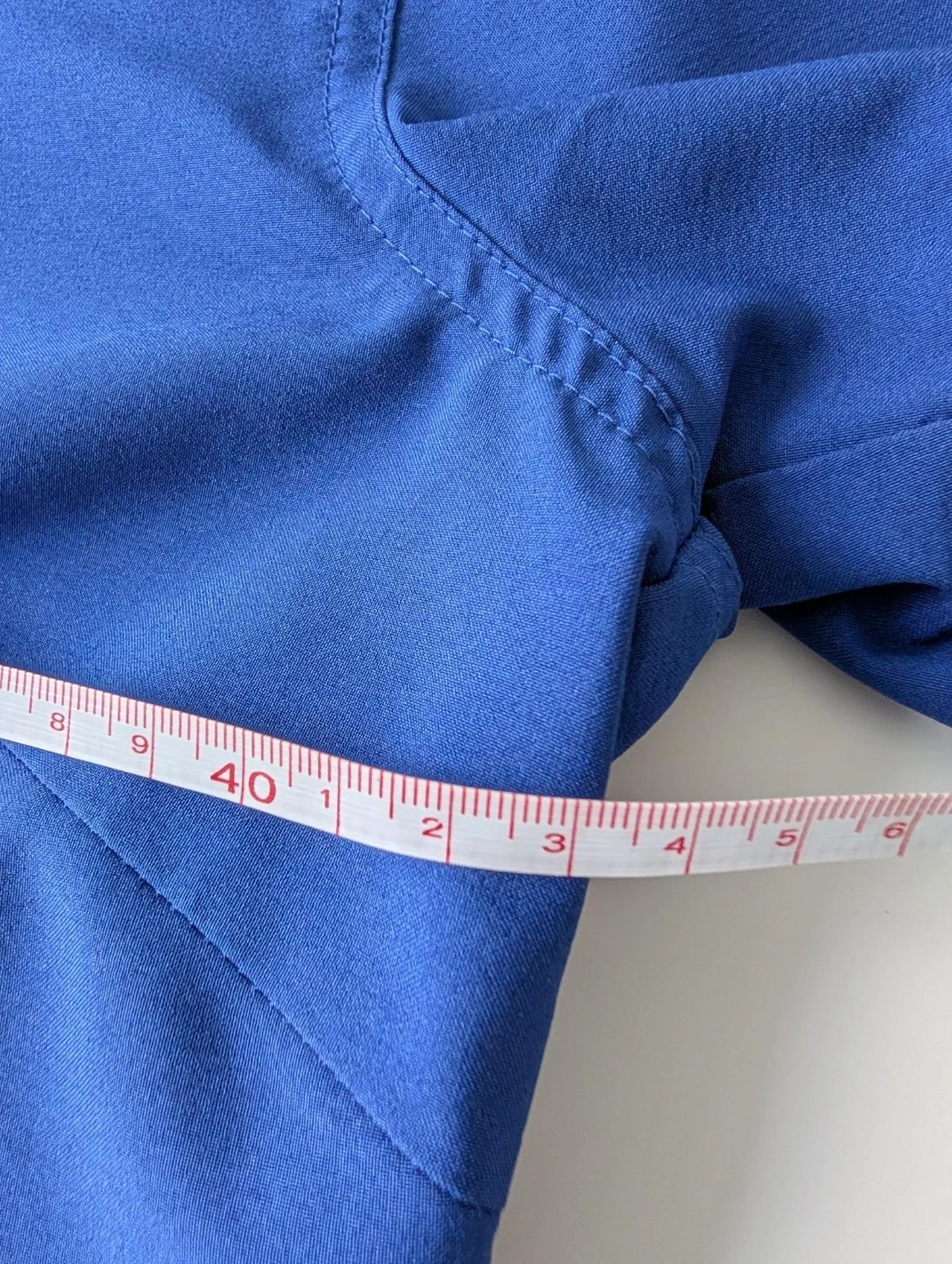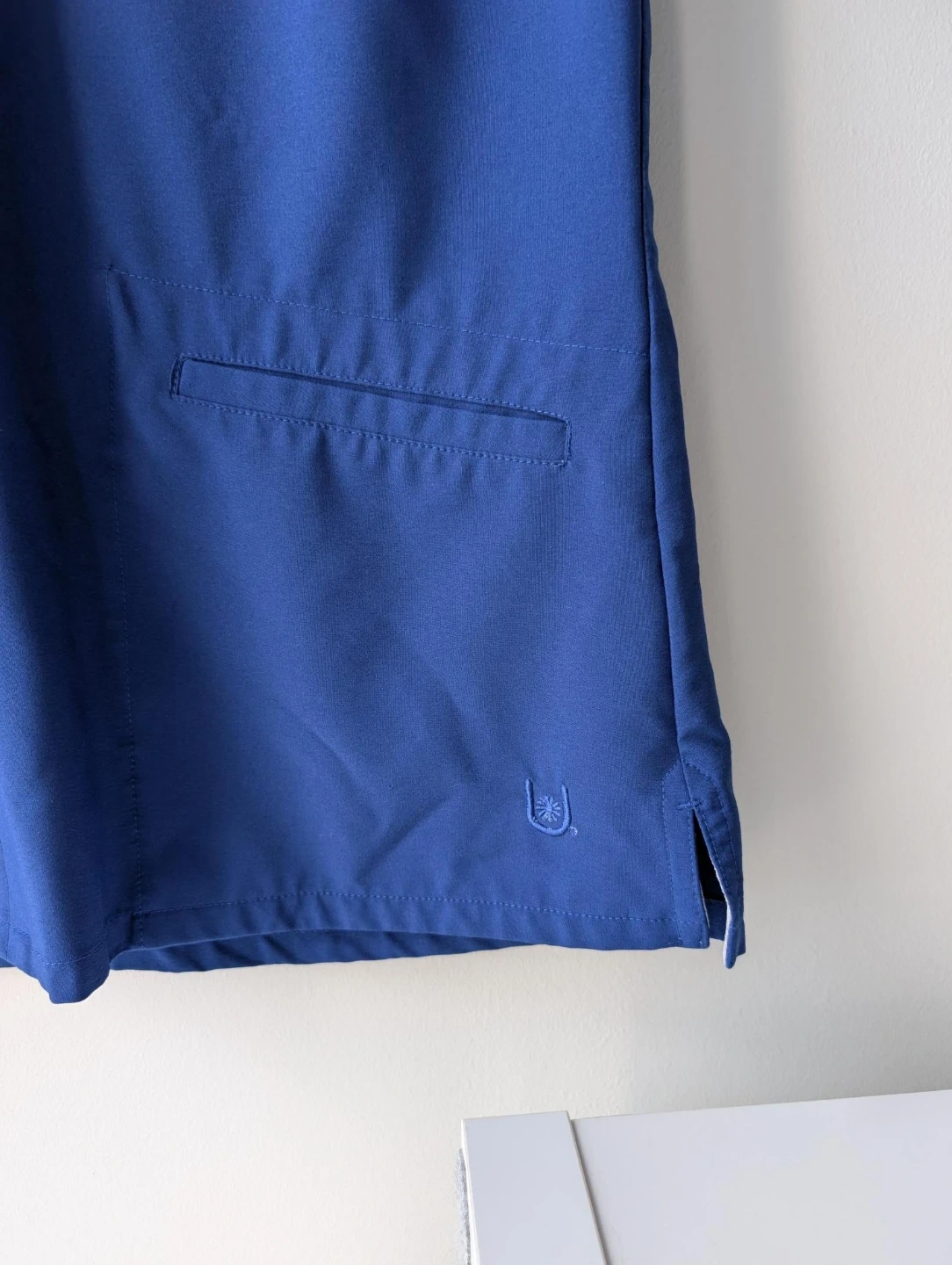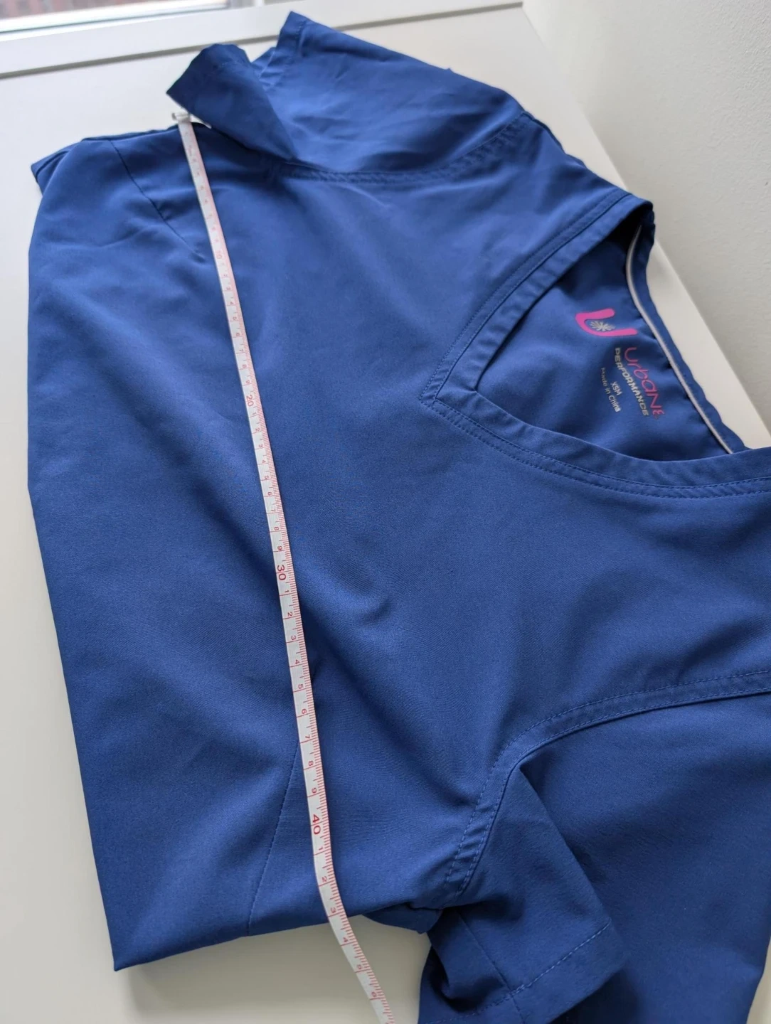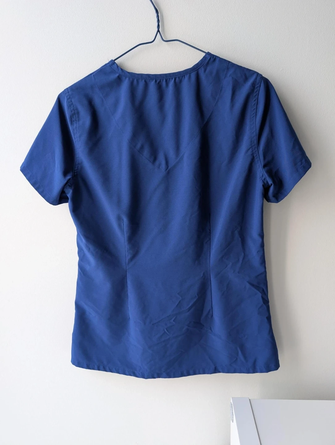 This is a blue Urbane Performance scrub top. It's a size XSM. It features two front pockets and a small chest pocket.