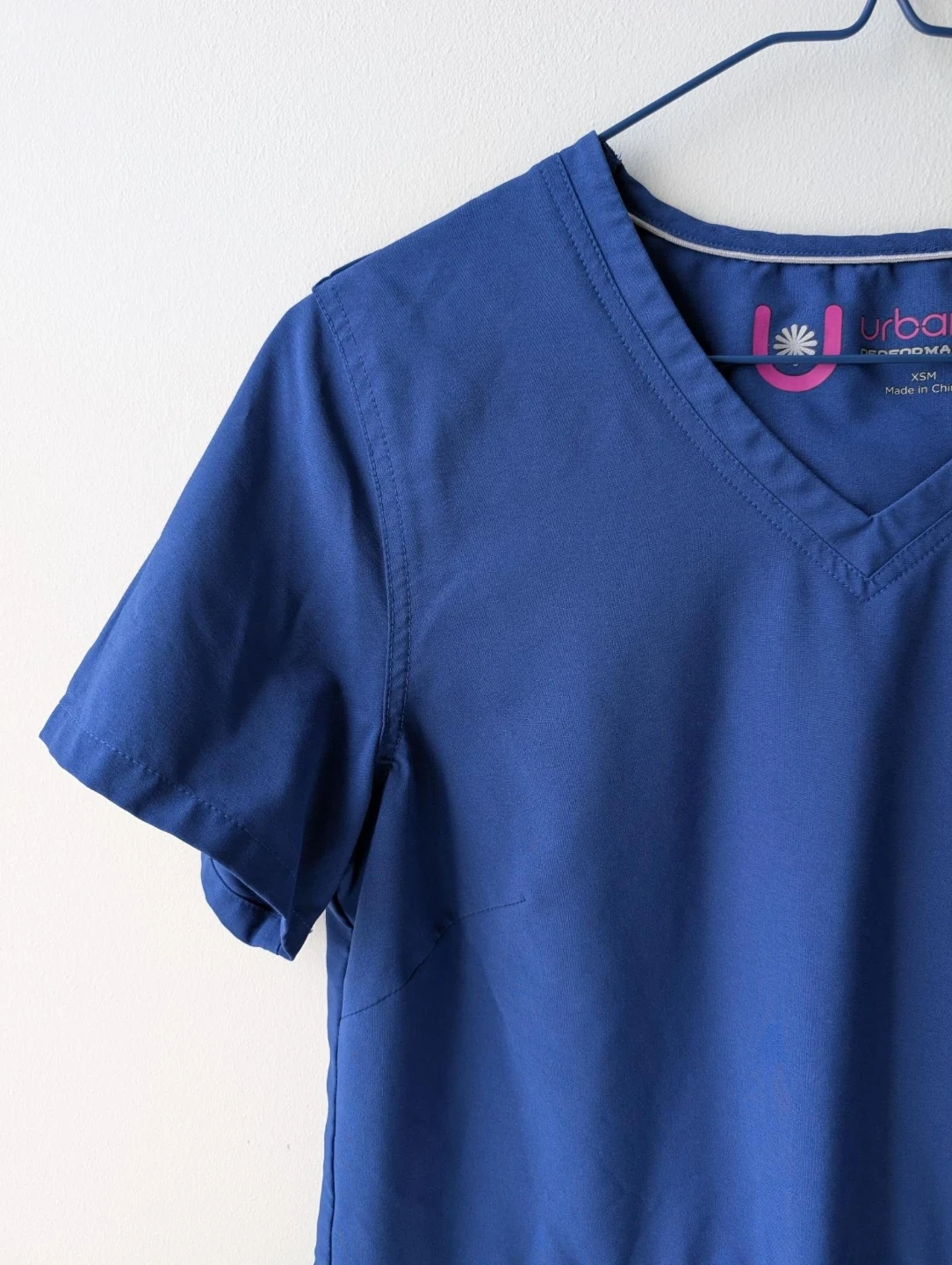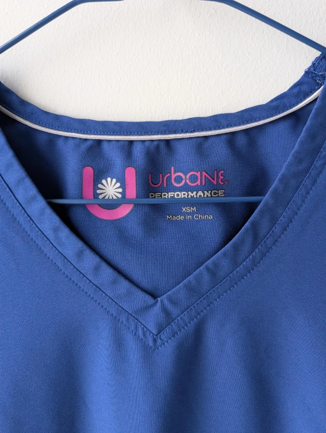 This is a blue Urbane Performance scrub top. It's a size XSM. It features two front pockets and a small chest pocket.