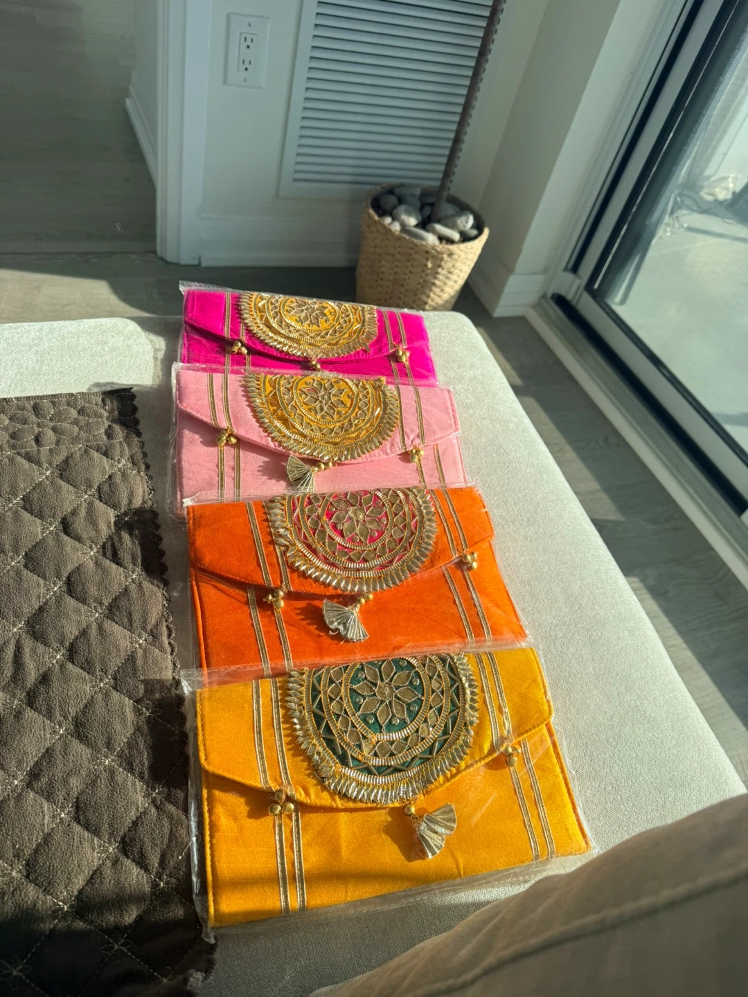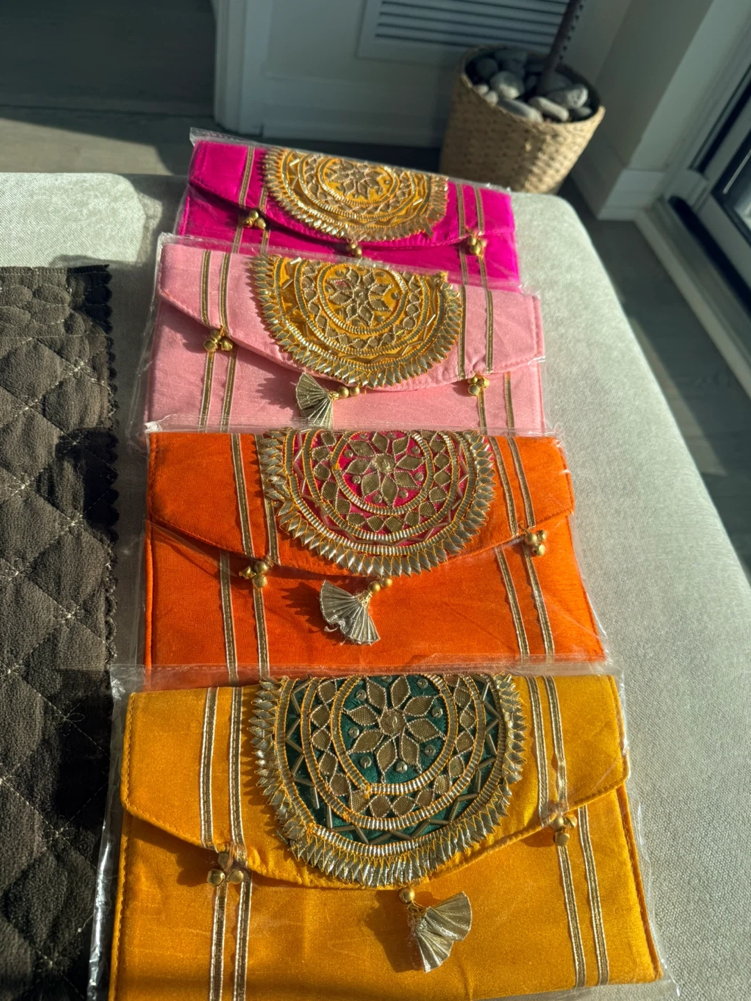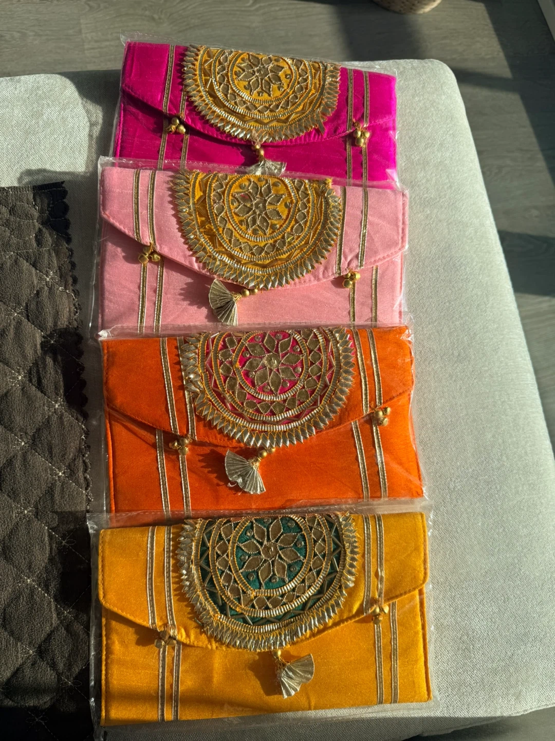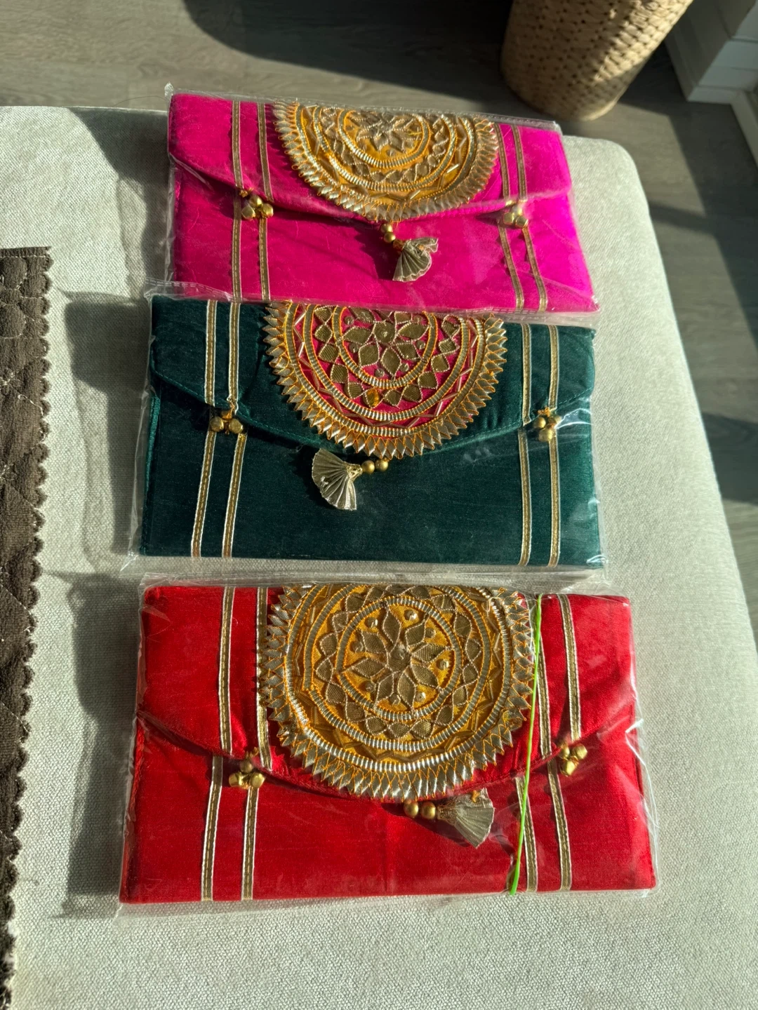Brand new Colourful embroidered clutches. Each clutch is adorned with intricate gold detailing and tassels. Perfect for special occasions or to add a pop of colour to any outfit or gifting