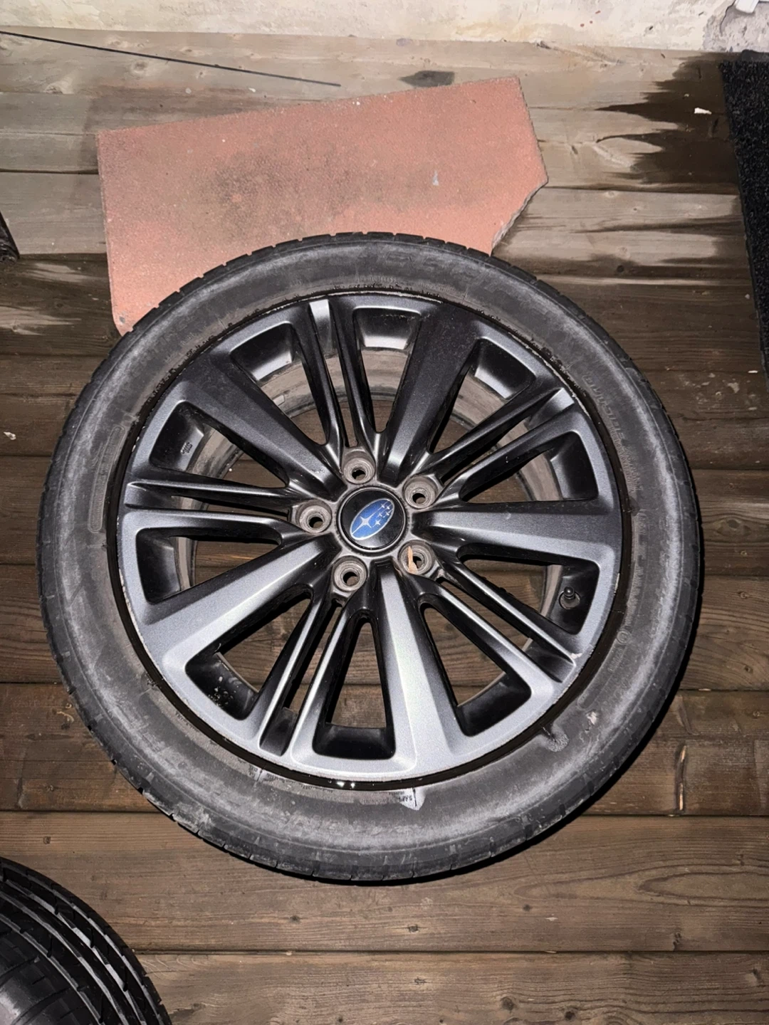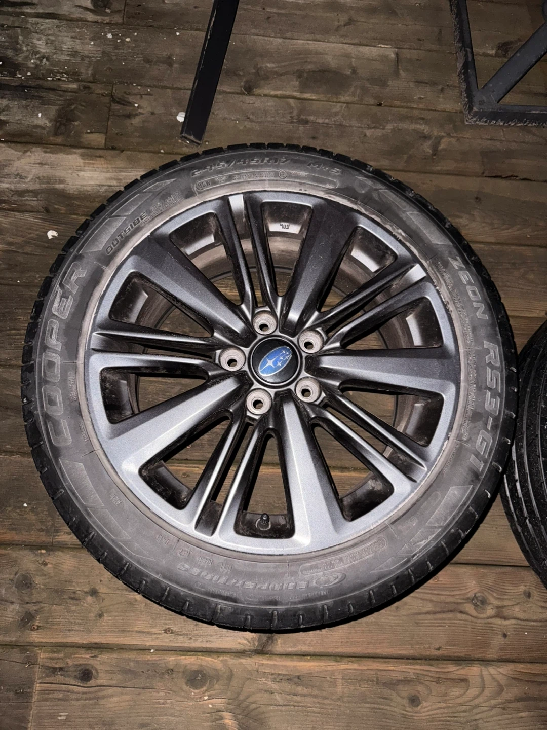 Set of four Subaru alloy wheels with Cooper Zeon RS3-G1 tires. Wheels are 17 inches. Tires are 245/45R17. These are good for replacing worn tires or upgrading your vehicle's look! Willing to deliver