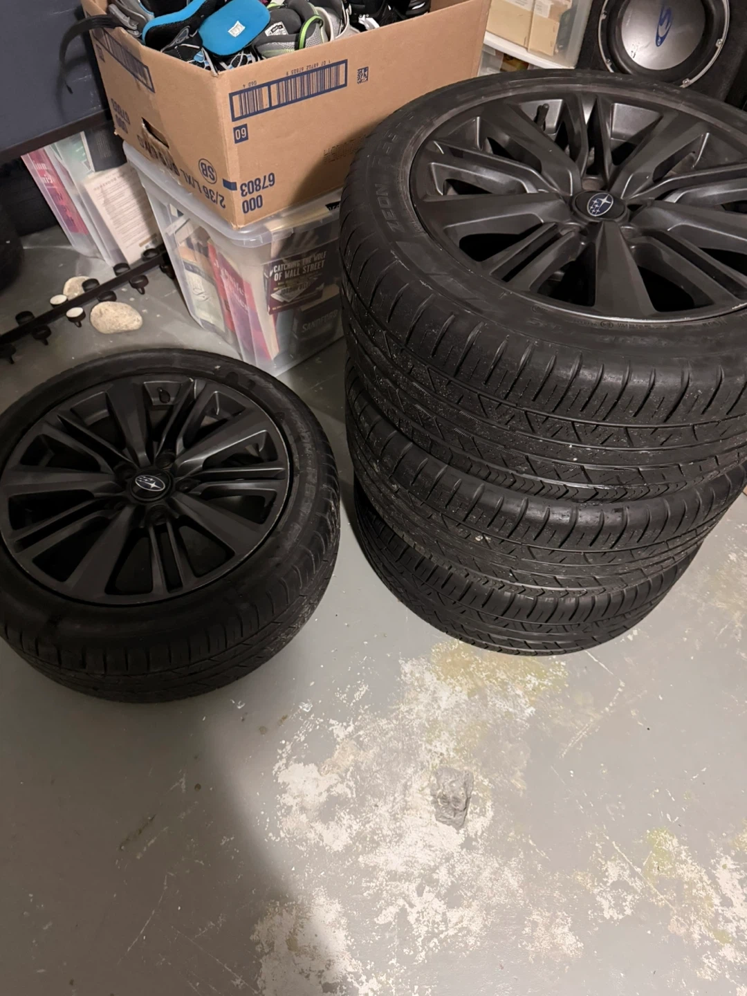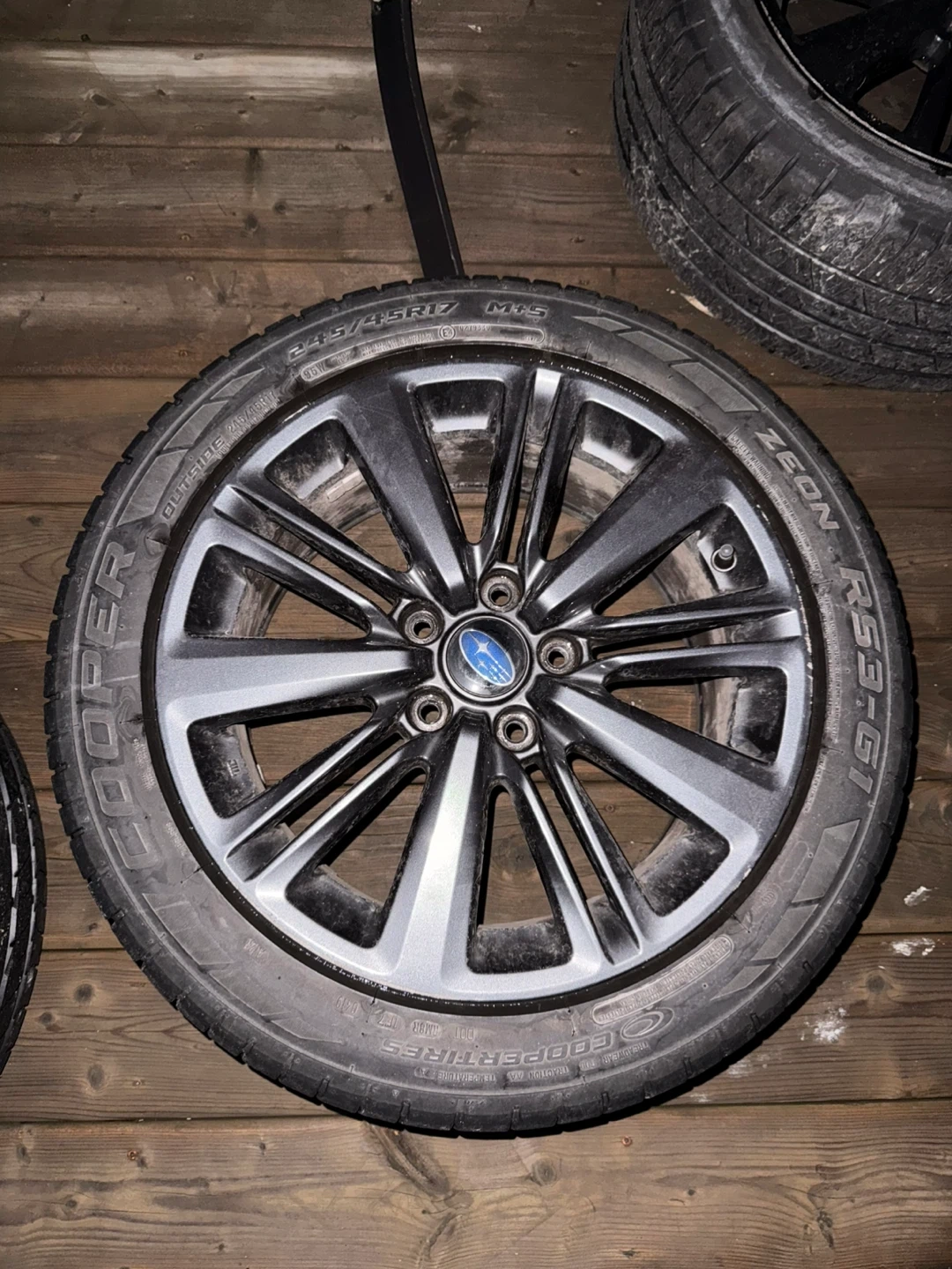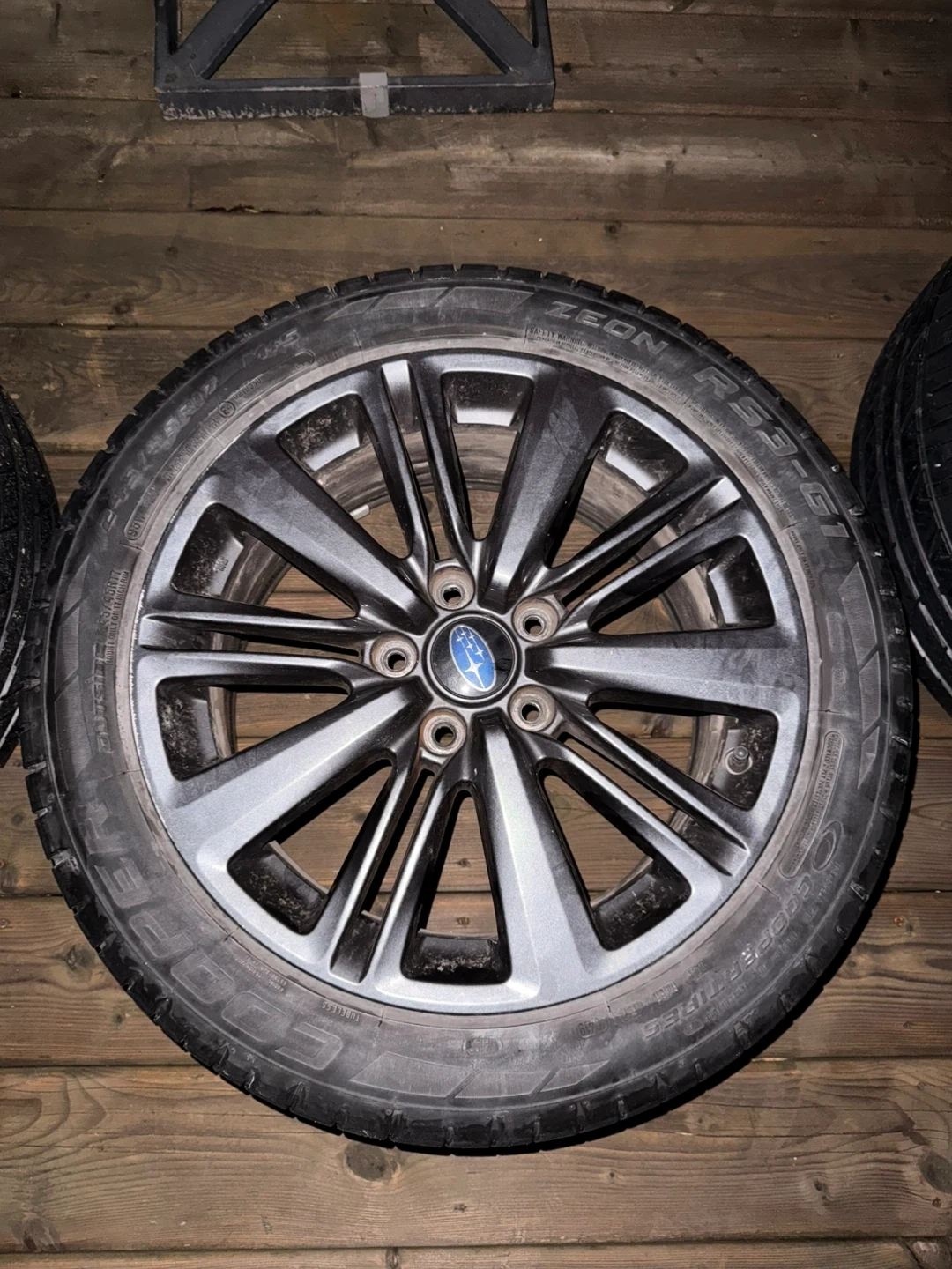 Set of four Subaru alloy wheels with Cooper Zeon RS3-G1 tires. Wheels are 17 inches. Tires are 245/45R17. These are good for replacing worn tires or upgrading your vehicle's look! Willing to deliver