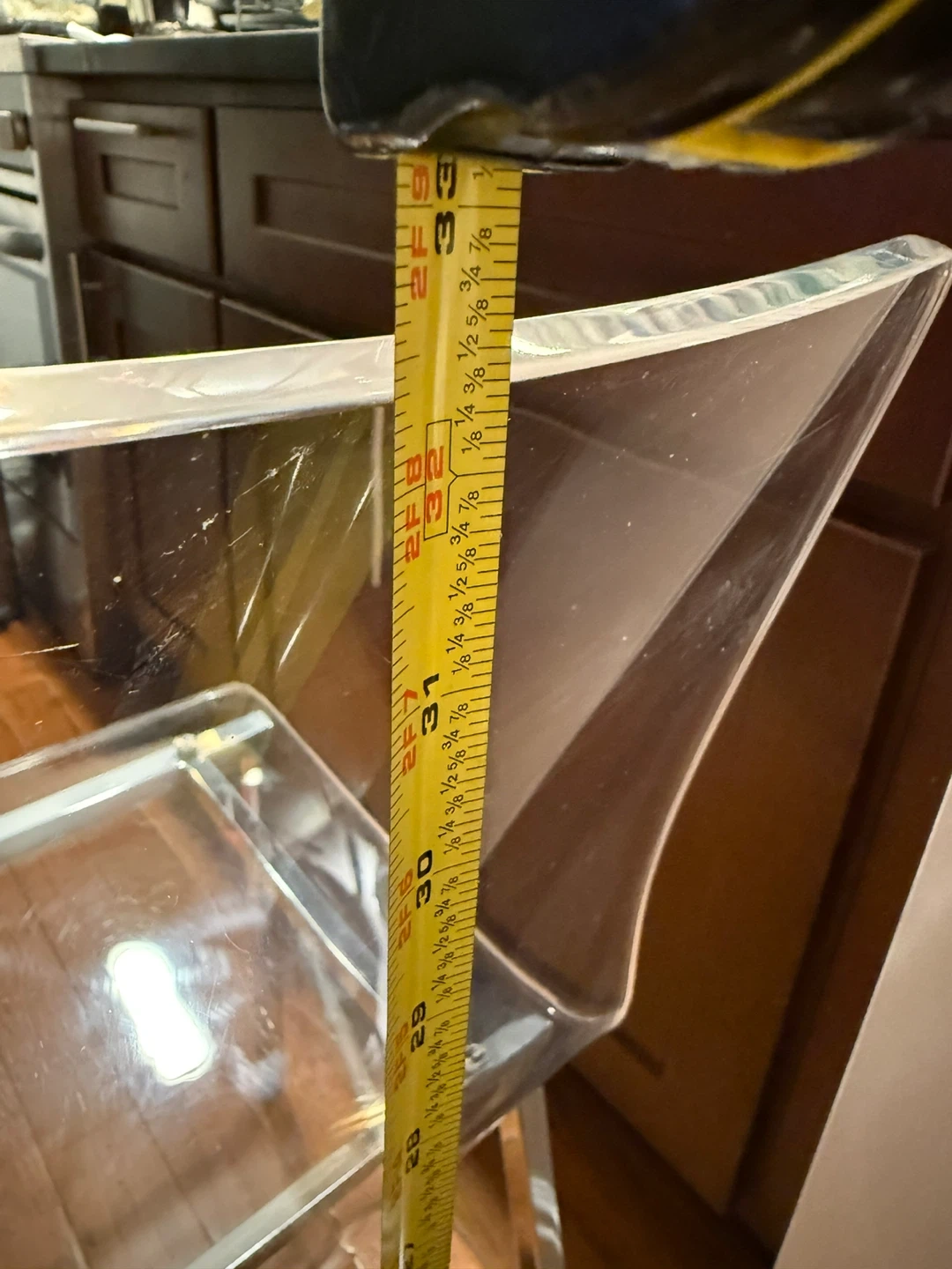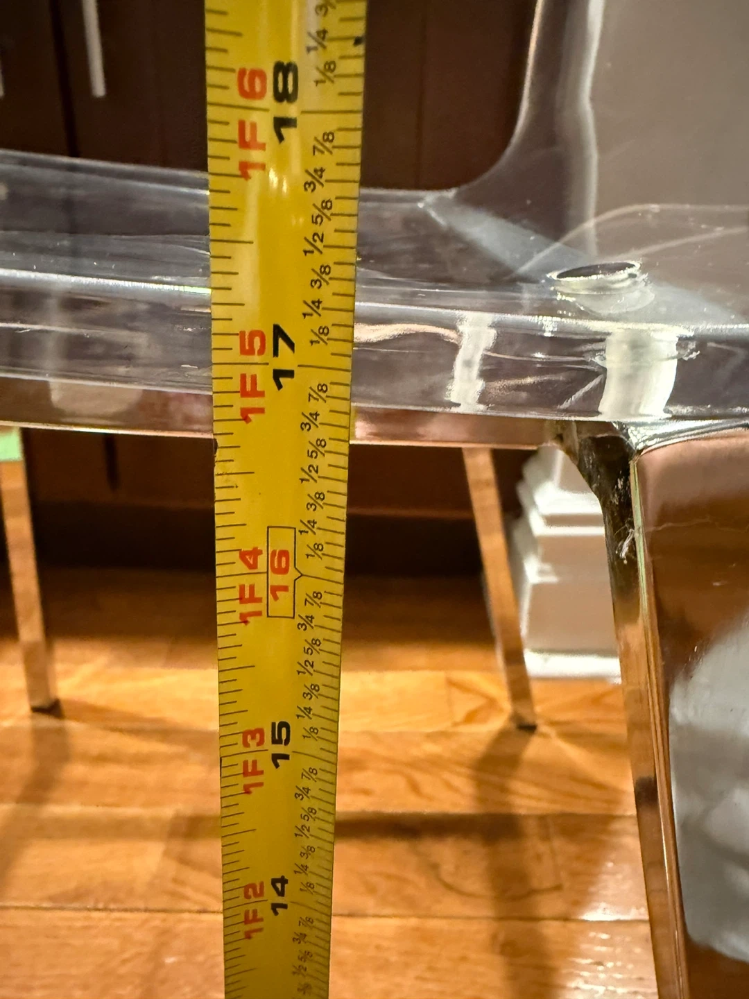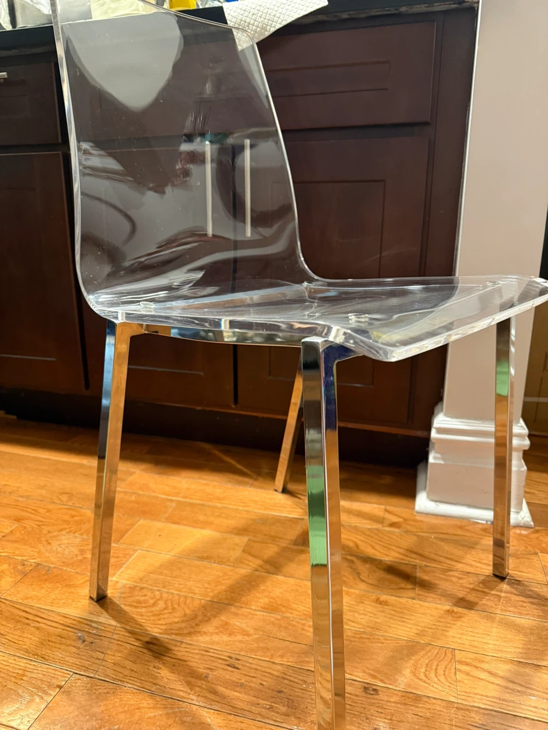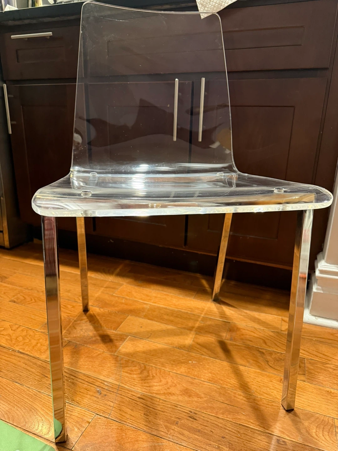 From CB2 no longer sale at the company. This chair features a modern ghost design with a clear acrylic seat and back. It's supported by durable chrome legs. Seat height is approximately 17 inches.