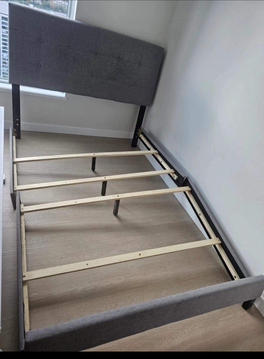Grey upholstered bed frame with wooden slats, headboard included. No mattress or box spring, also to hold the frame together you need some parts which we don't have😅