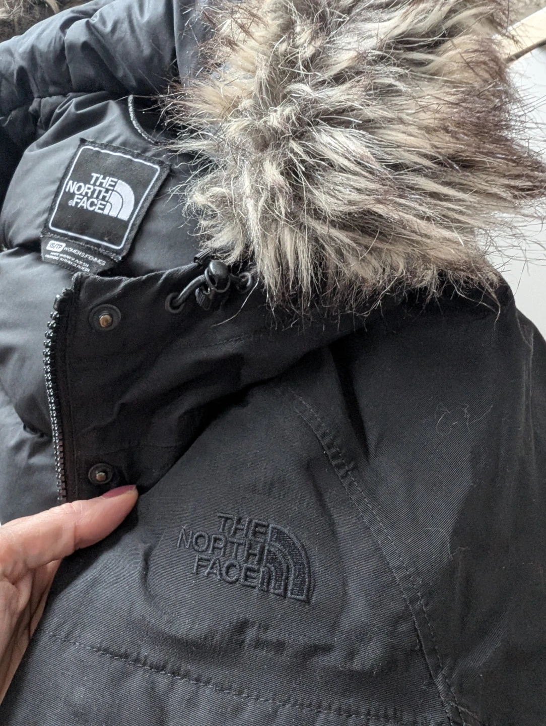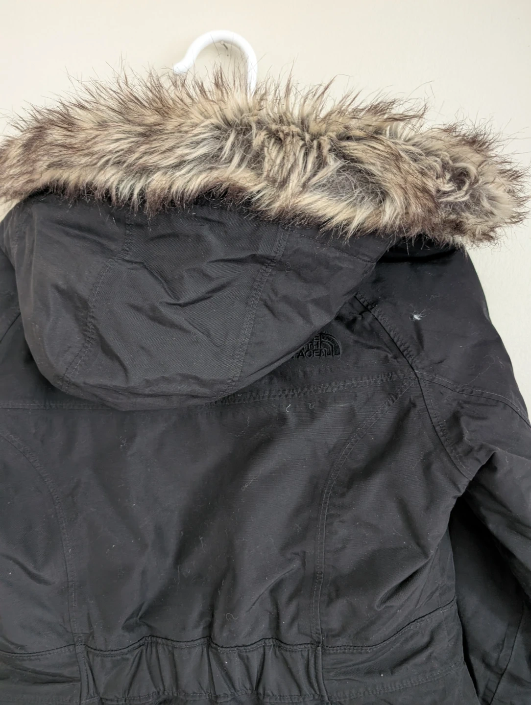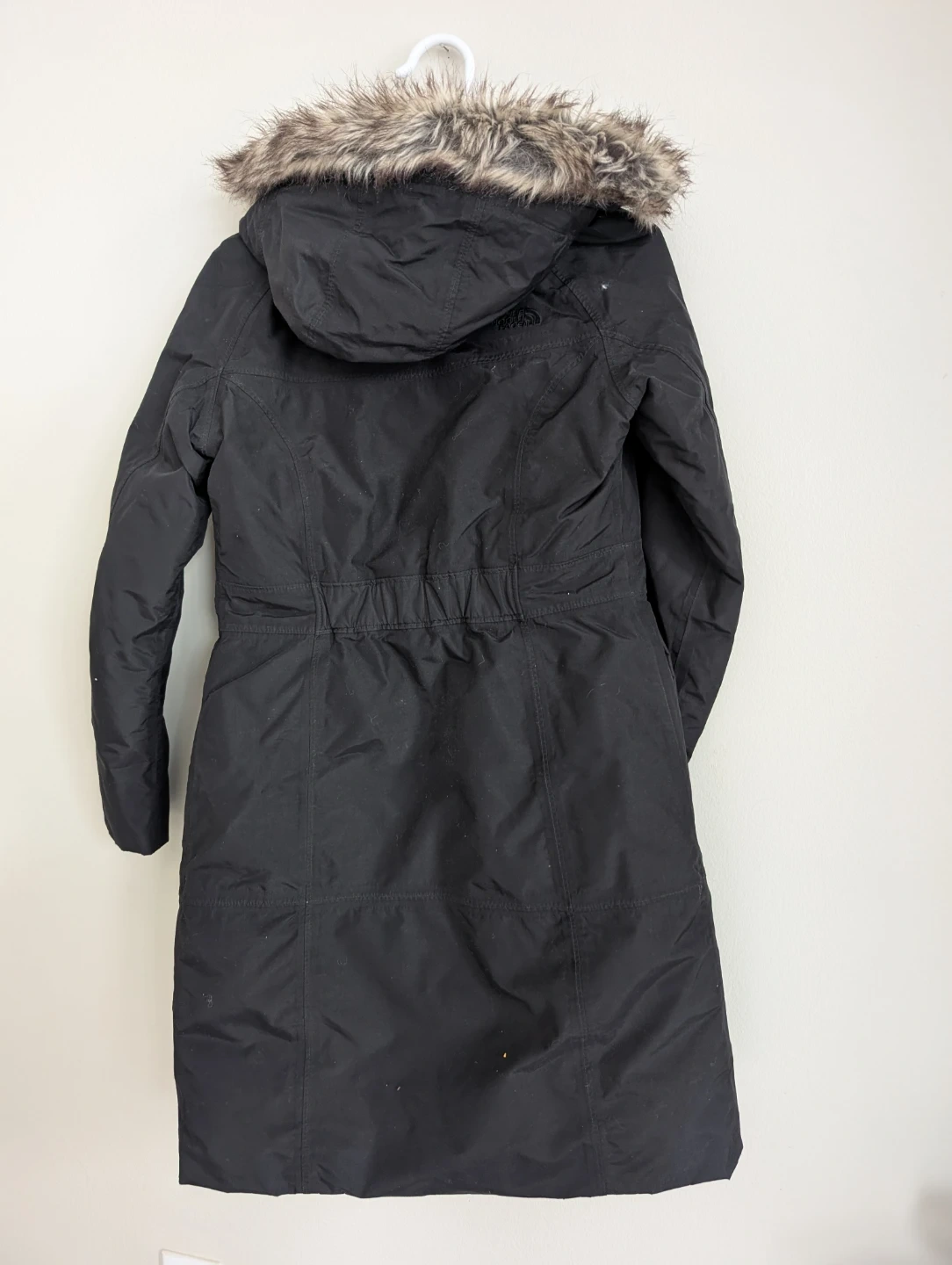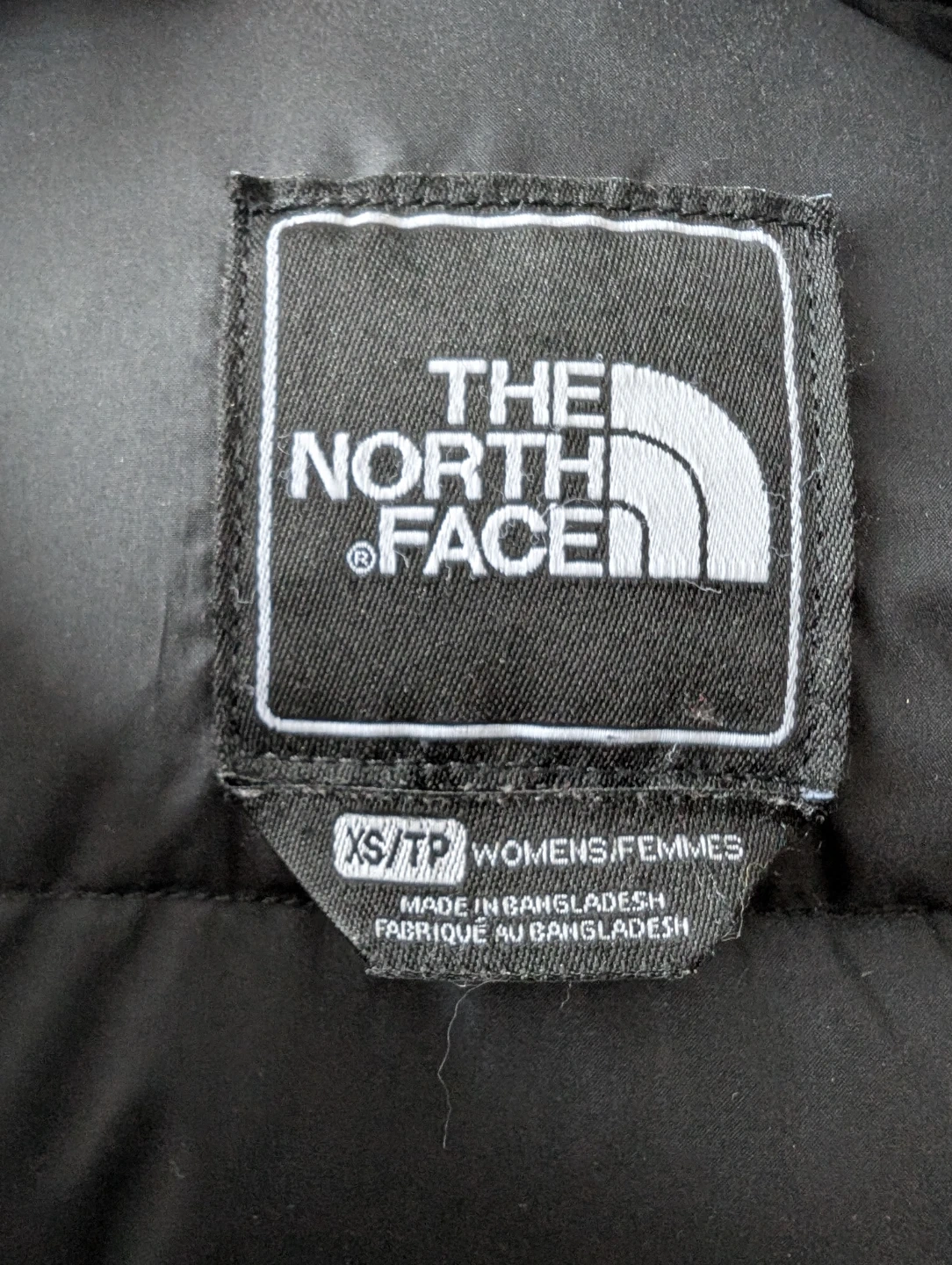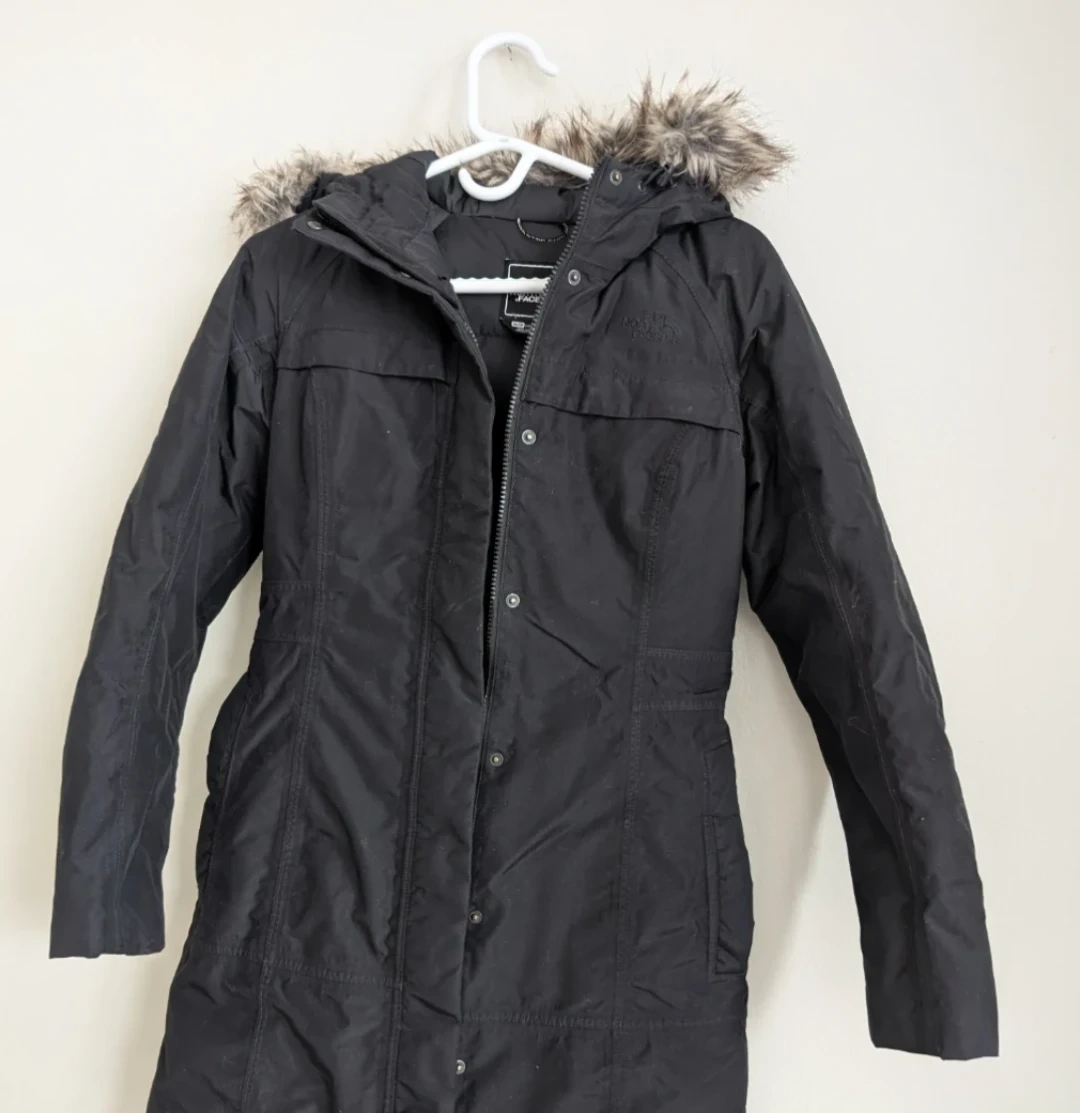 This is a black parka coat from The North Face, featuring a faux fur trimmed hood. It's a women's size XS/TP. Made in Bangladesh.