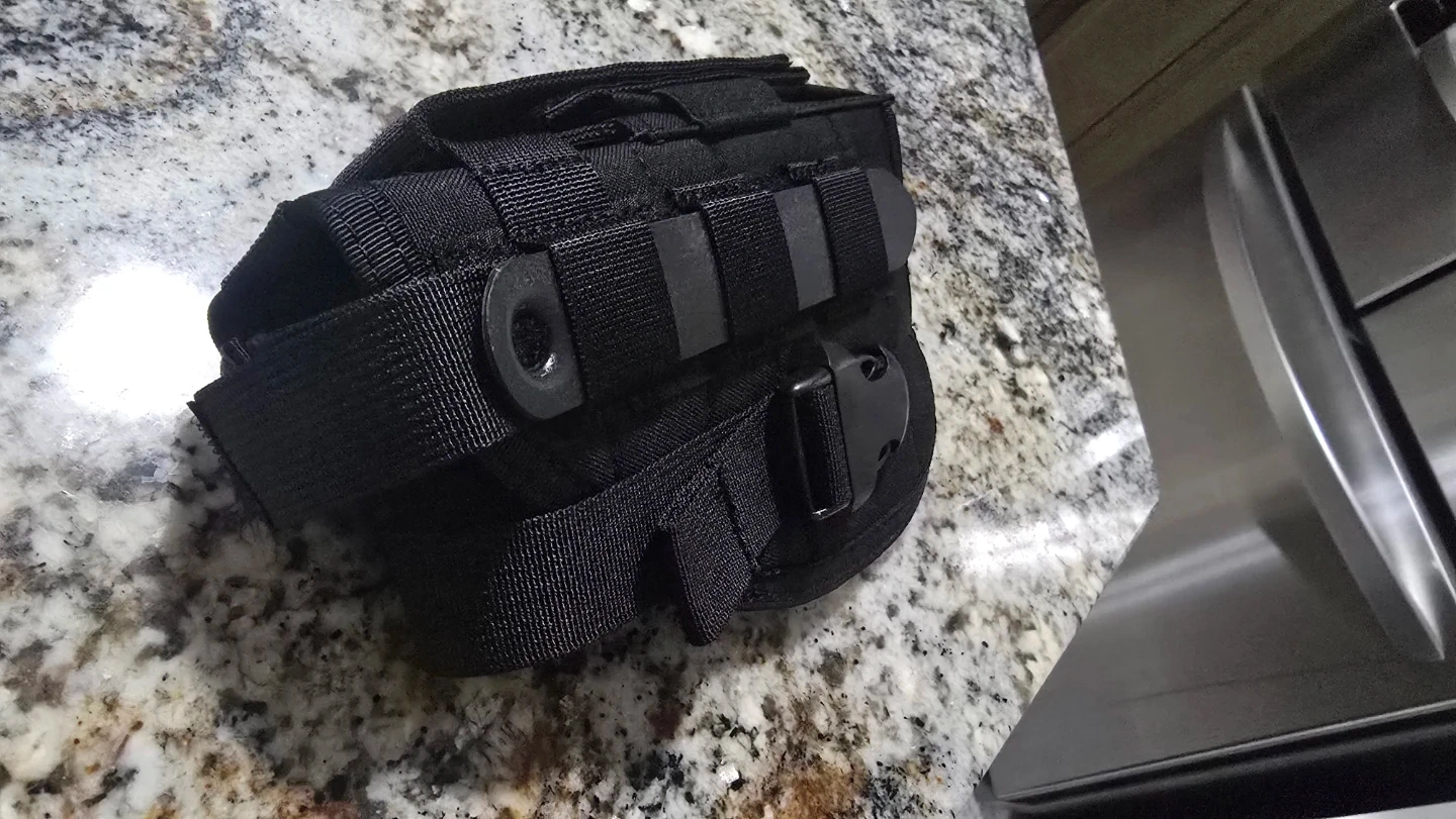 This is a black tactical holster, likely made of durable nylon. It features multiple straps and a buckle for secure closure. It's designed for carrying gear on a belt or vest.
