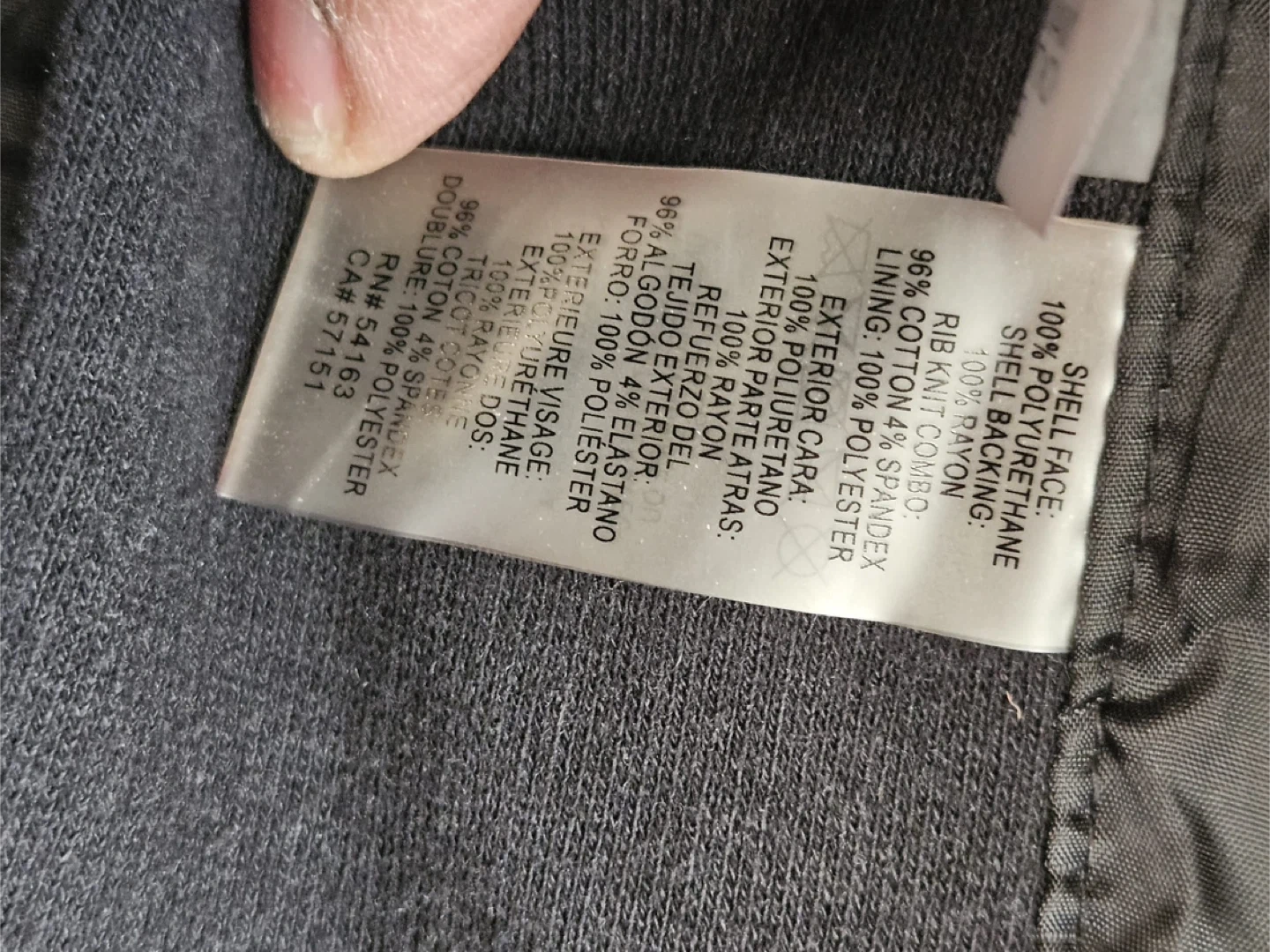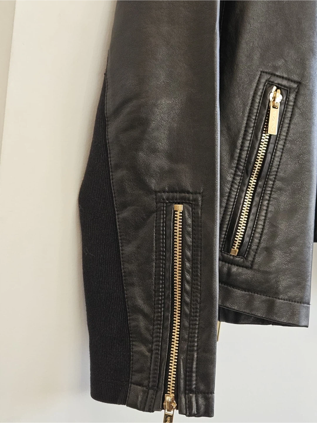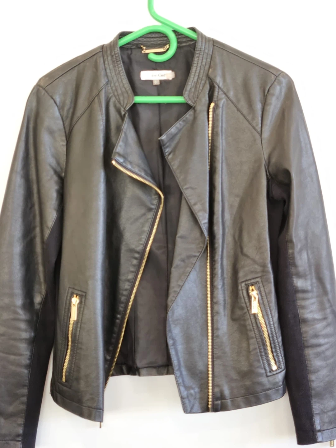This Calvin Klein jacket is black with gold-tone hardware. It's a size small, featuring a faux leather exterior and ribbed fabric panels on the sleeves. It's a classic moto style with an asymmetrical zip closure and zippered pockets.