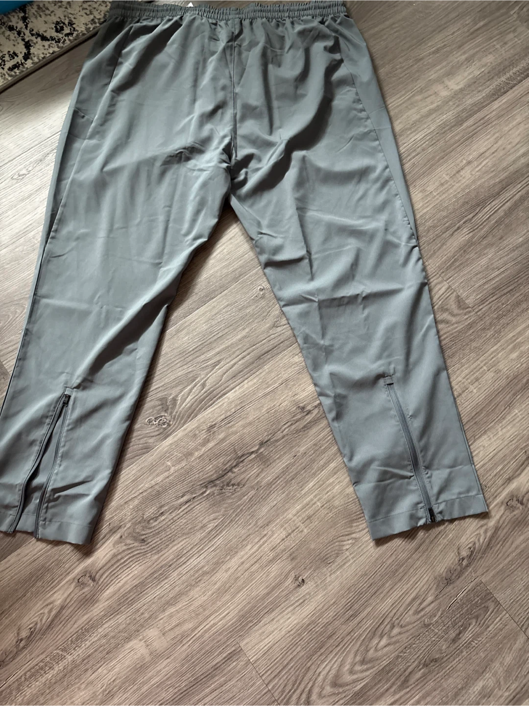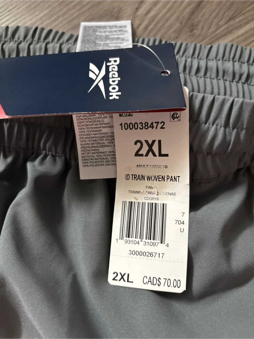 Reebok ID Train Woven Pants for men in size 2XL. These grey pants are made with 100% polyester. They feature zippered leg openings for easy on and off. Perfect for training sessions!