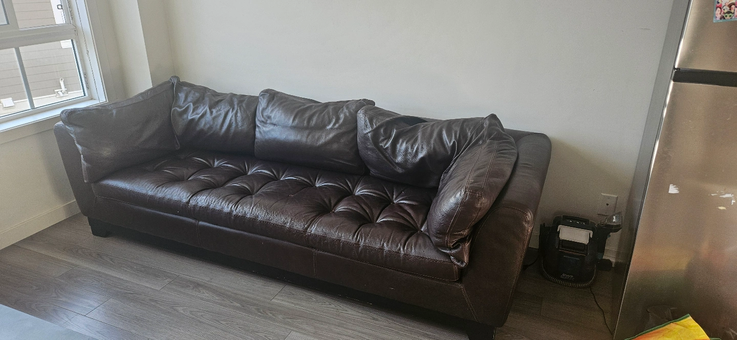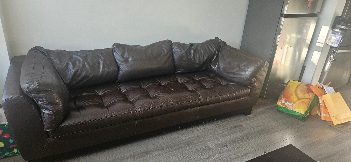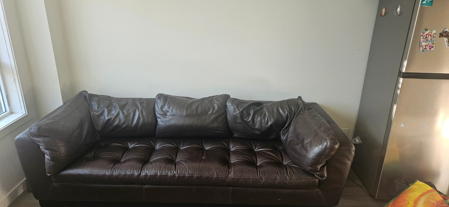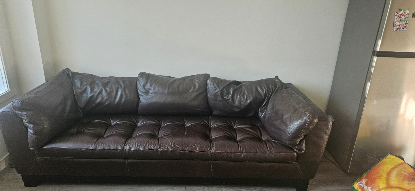 Dark brown leather sofa. Button tufting. Three included cushions. It's for free. You can pick it up yourself. It's for three people to sit. Pick up in Sherwoodlane NW.