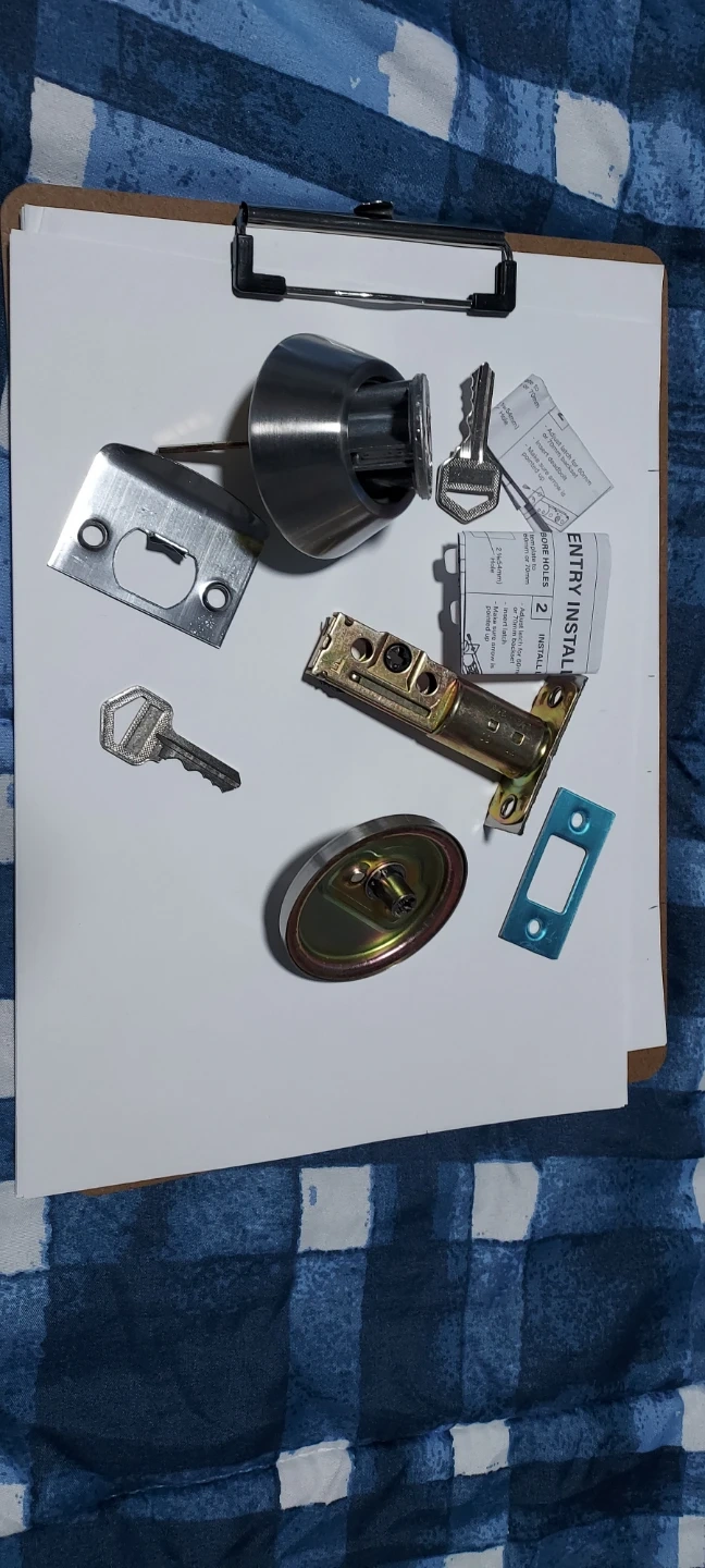 Selling an entry install deadbolt lock set. It comes with the necessary components for installation, including the latch, strike plate, and keys. Please refer to the included instructions for proper installation.