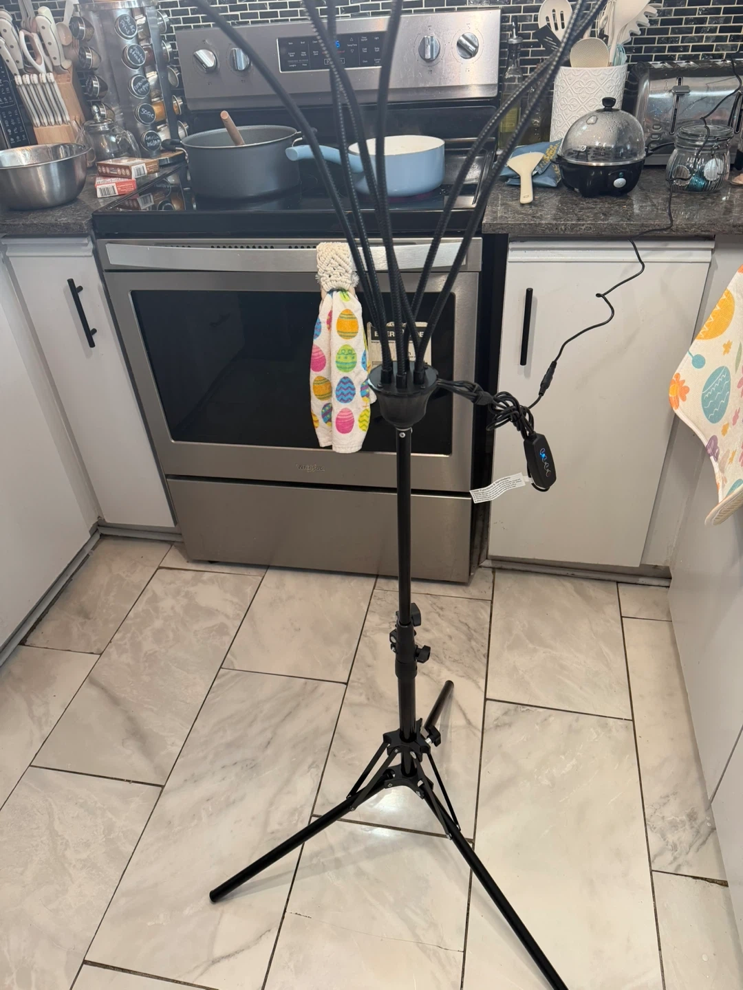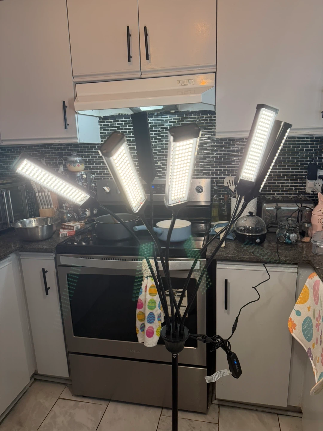 This is a multi-headed adjustable ring light with a tripod stand. It's perfect for creating videos or taking photos with even lighting. The stand is adjustable in height, and the lights themselves can be positioned in various ways. Includes all components shown in box.
