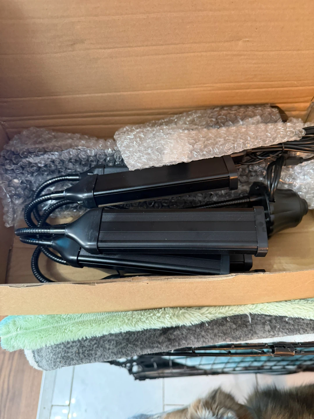 This is a multi-headed adjustable ring light with a tripod stand. It's perfect for creating videos or taking photos with even lighting. The stand is adjustable in height, and the lights themselves can be positioned in various ways. Includes all components shown in box.