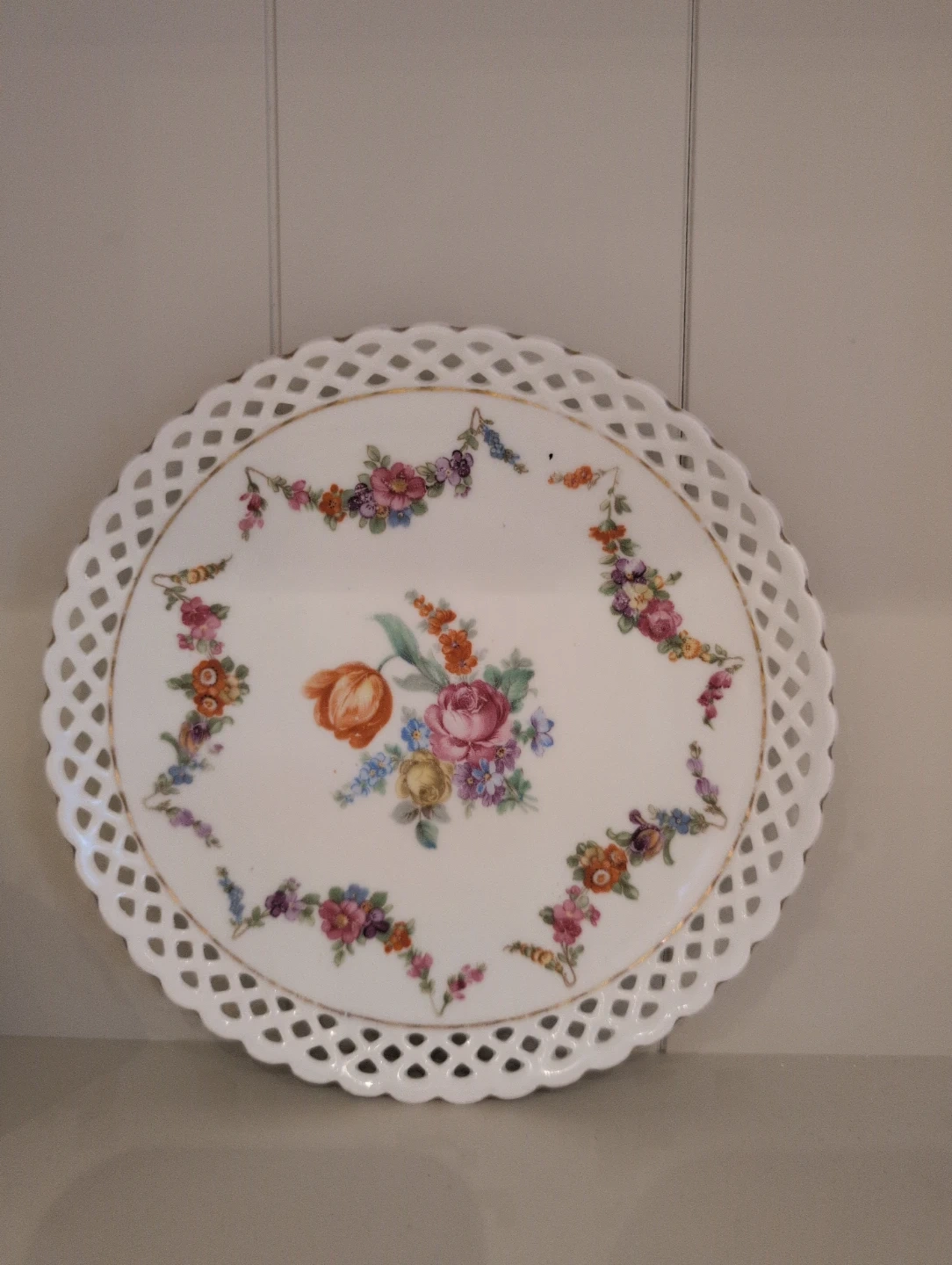 A lovely white ceramic plate featuring a delicate lattice edge and a colourful floral bouquet painted in the centre. It's adorned with gold trim. This piece would make a beautiful decorative accent.