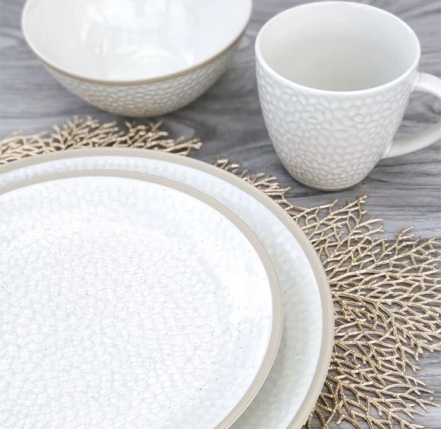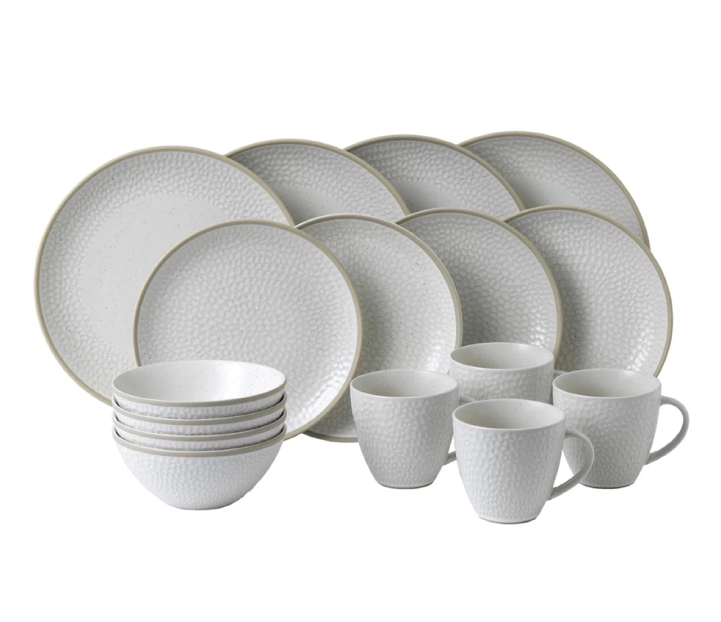 Looking to sell a 16-piece stoneware dinnerware set. Includes plates, bowls, and mugs. The set has a unique textured design and a neutral colour that fits well with any decor. Perfect for everyday use or special occasions!