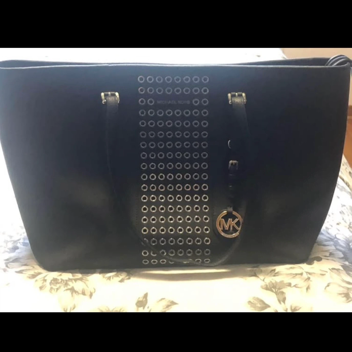 Black Michael Kors tote bag with silver-tone stud detailing. It's made of leather and has double top handles. Includes the signature MK charm.