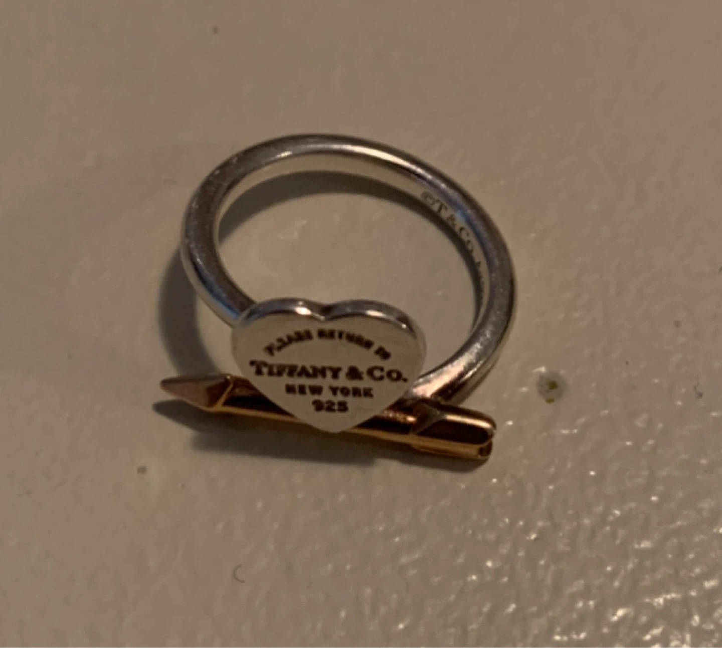 A sterling silver ring featuring the iconic Return to Tiffany heart charm with an accompanying rose gold-toned arrow accent. Engraved with "Please Return To Tiffany & Co. New York 925" on the heart. It's a beautiful piece that adds a touch of classic elegance.