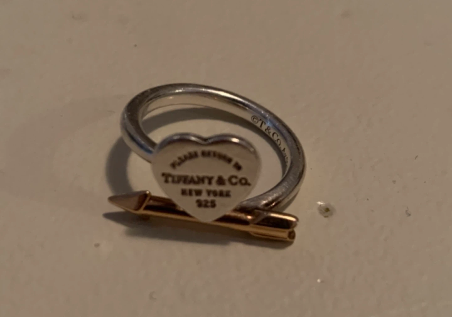 A sterling silver ring featuring the iconic Return to Tiffany heart charm with an accompanying rose gold-toned arrow accent. Engraved with "Please Return To Tiffany & Co. New York 925" on the heart. It's a beautiful piece that adds a touch of classic elegance.