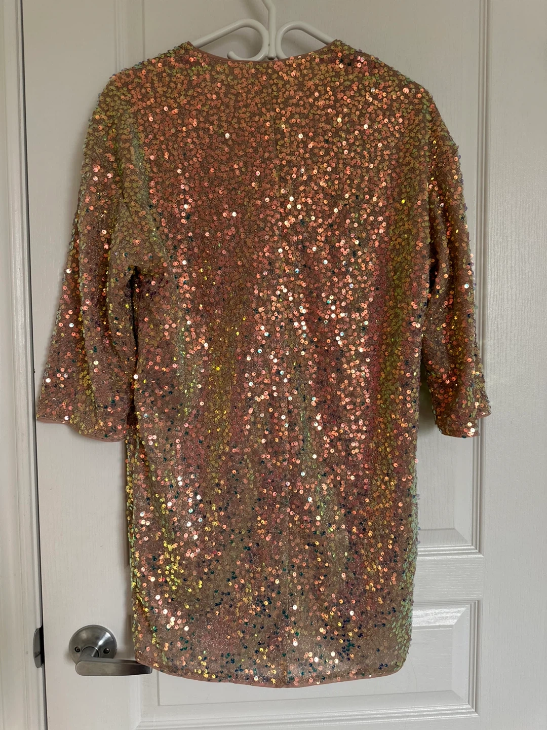 Sparkly H&M sequin dress in a champagne and pink iridescent colour. It's a size XS with 3/4 sleeves. Great for a party or special occasion!