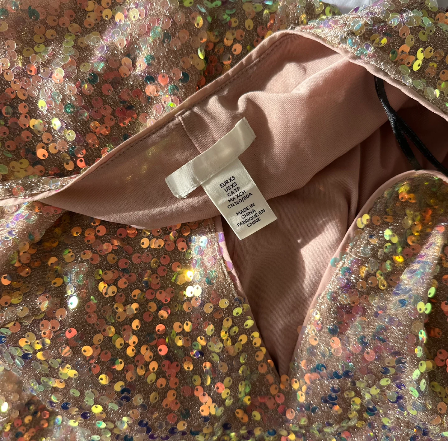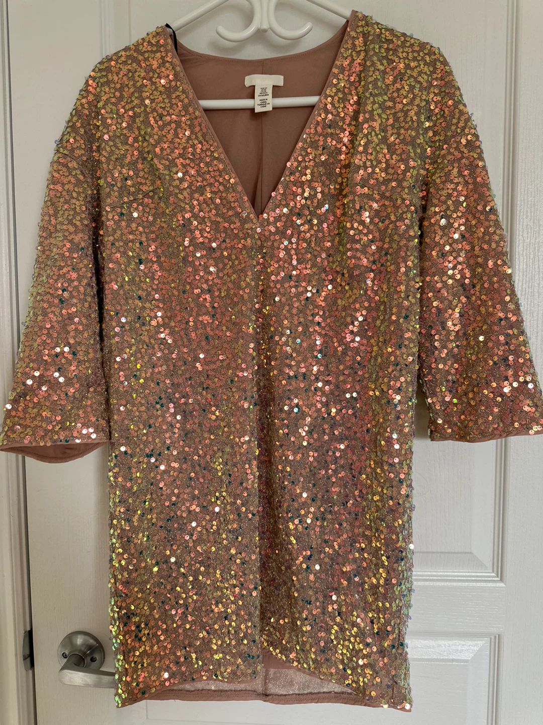 Sparkly H&M sequin dress in a champagne and pink iridescent colour. It's a size XS with 3/4 sleeves. Great for a party or special occasion!