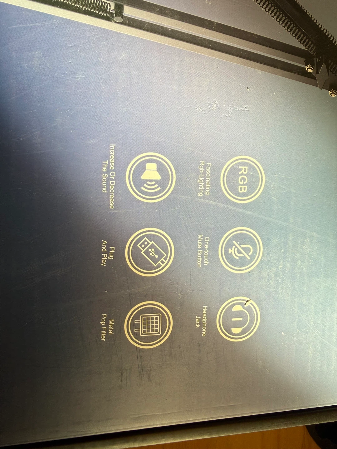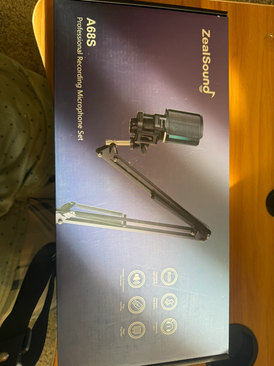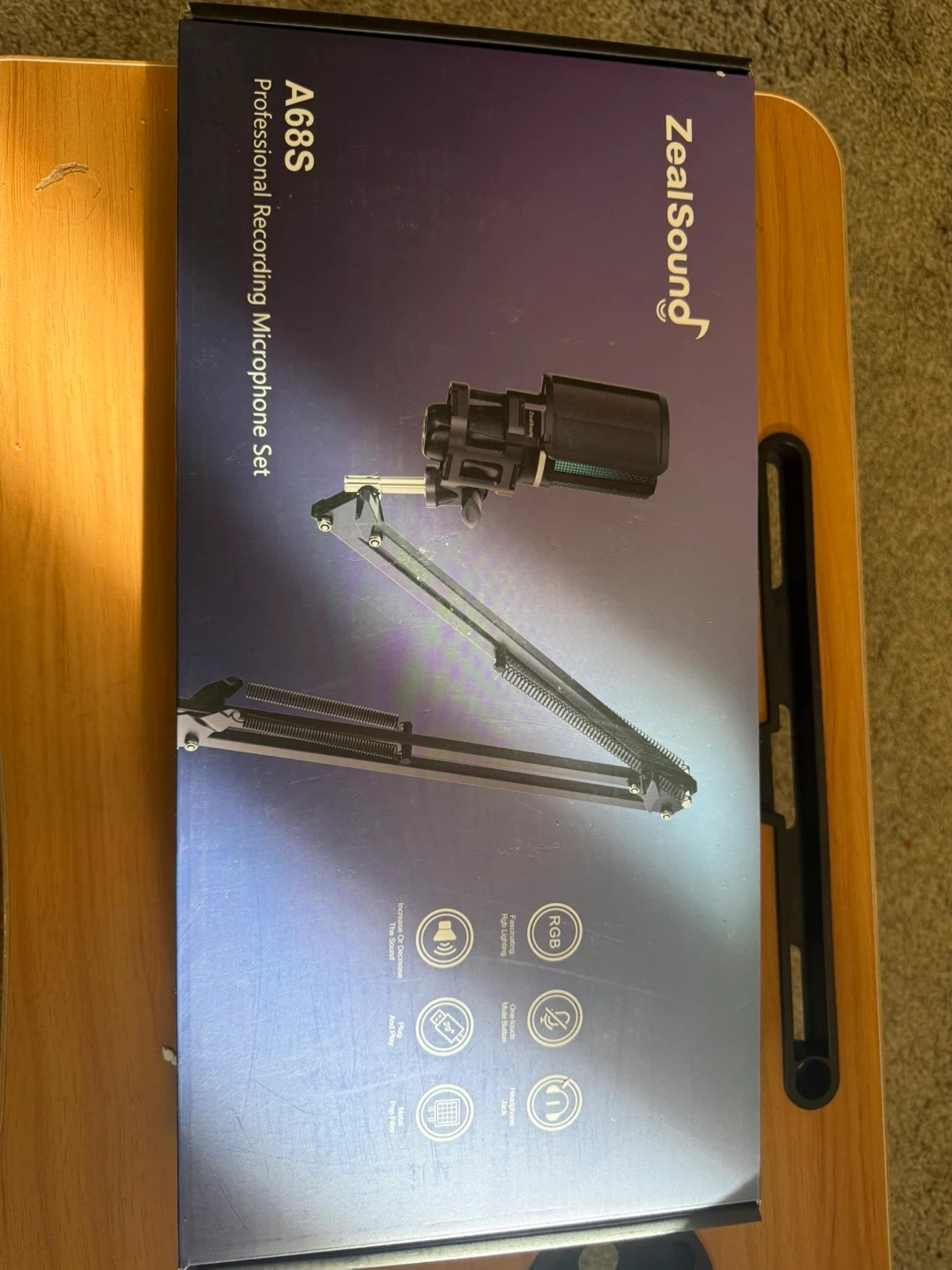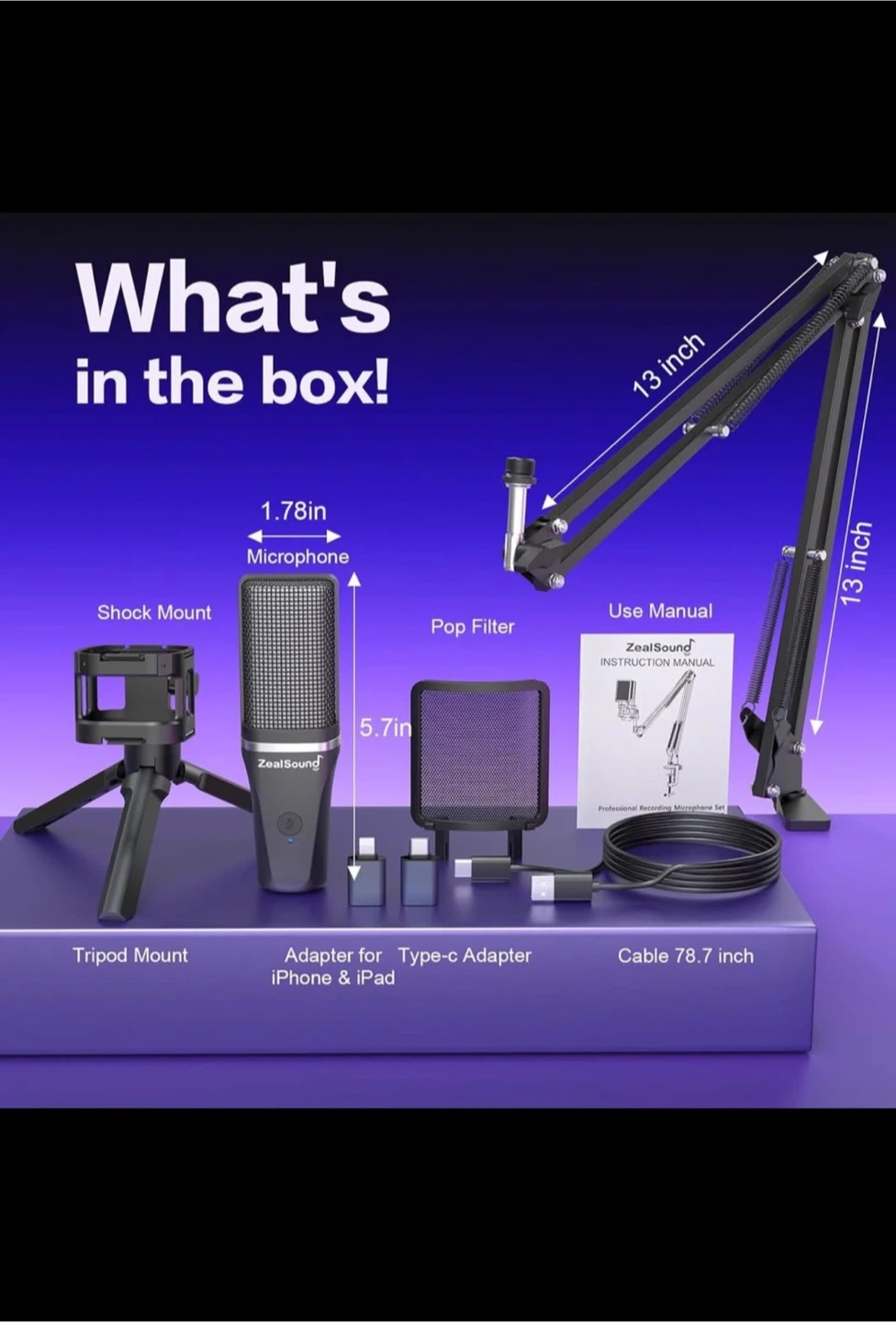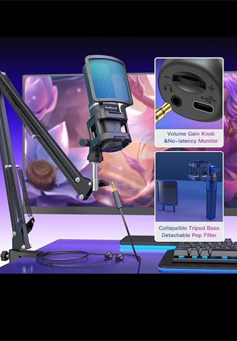 This ZealSound A68S professional recording microphone set includes the microphone, tripod, and pop filter. It features RGB lighting and a one-touch mute button. Plug and play functionality makes it easy to use. It also has a headphone jack for monitoring.