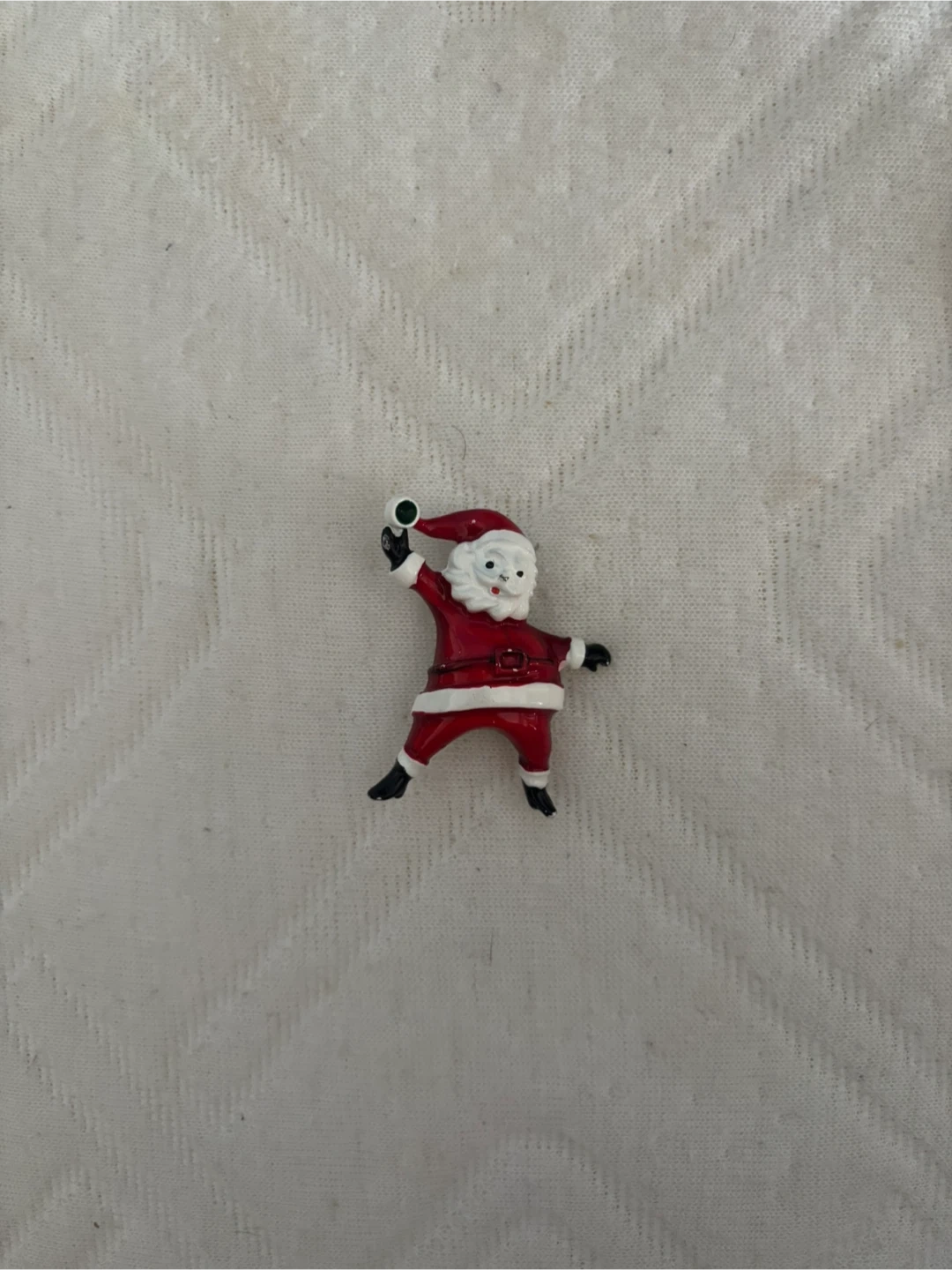 Here's a cute vintage Santa Claus pin, perfect for adding a festive touch to your outfit or holiday decor! It features Santa in his classic red suit, ready to throw a snowball. It's in good condition and ready to spread some Christmas cheer.