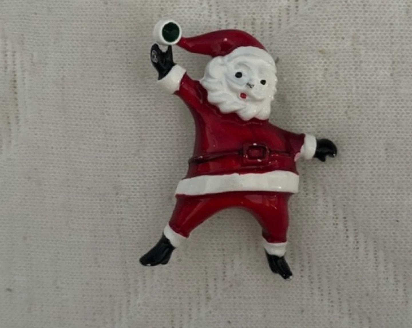 Here's a cute vintage Santa Claus pin, perfect for adding a festive touch to your outfit or holiday decor! It features Santa in his classic red suit, ready to throw a snowball. It's in good condition and ready to spread some Christmas cheer.