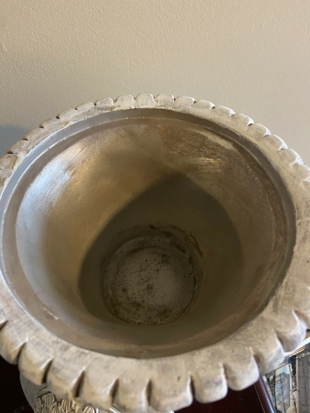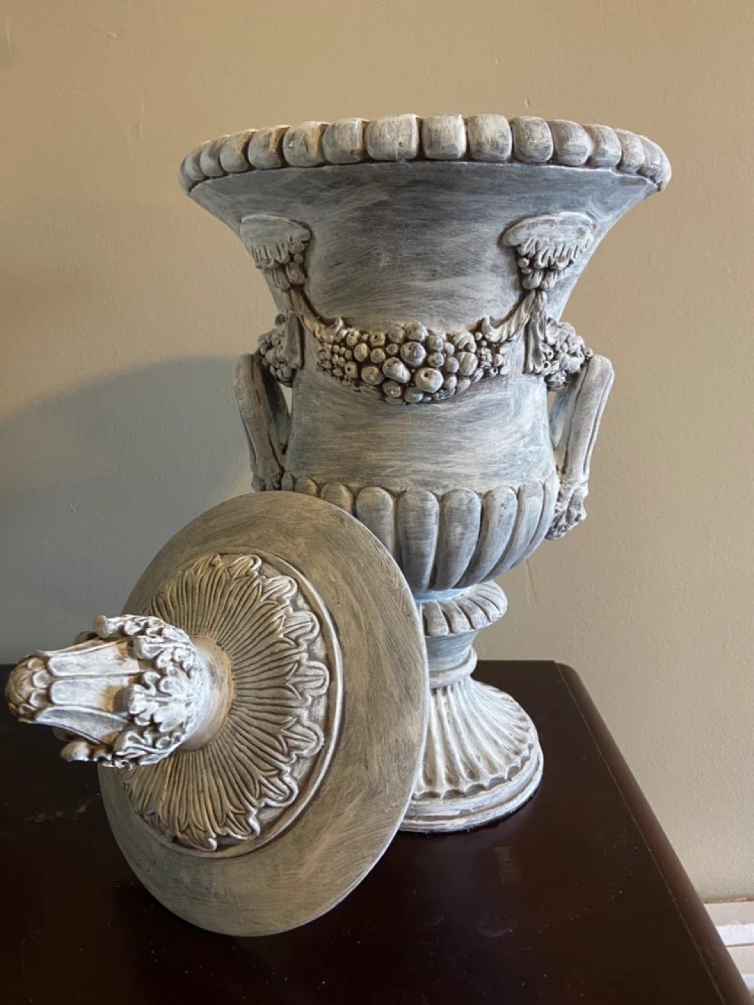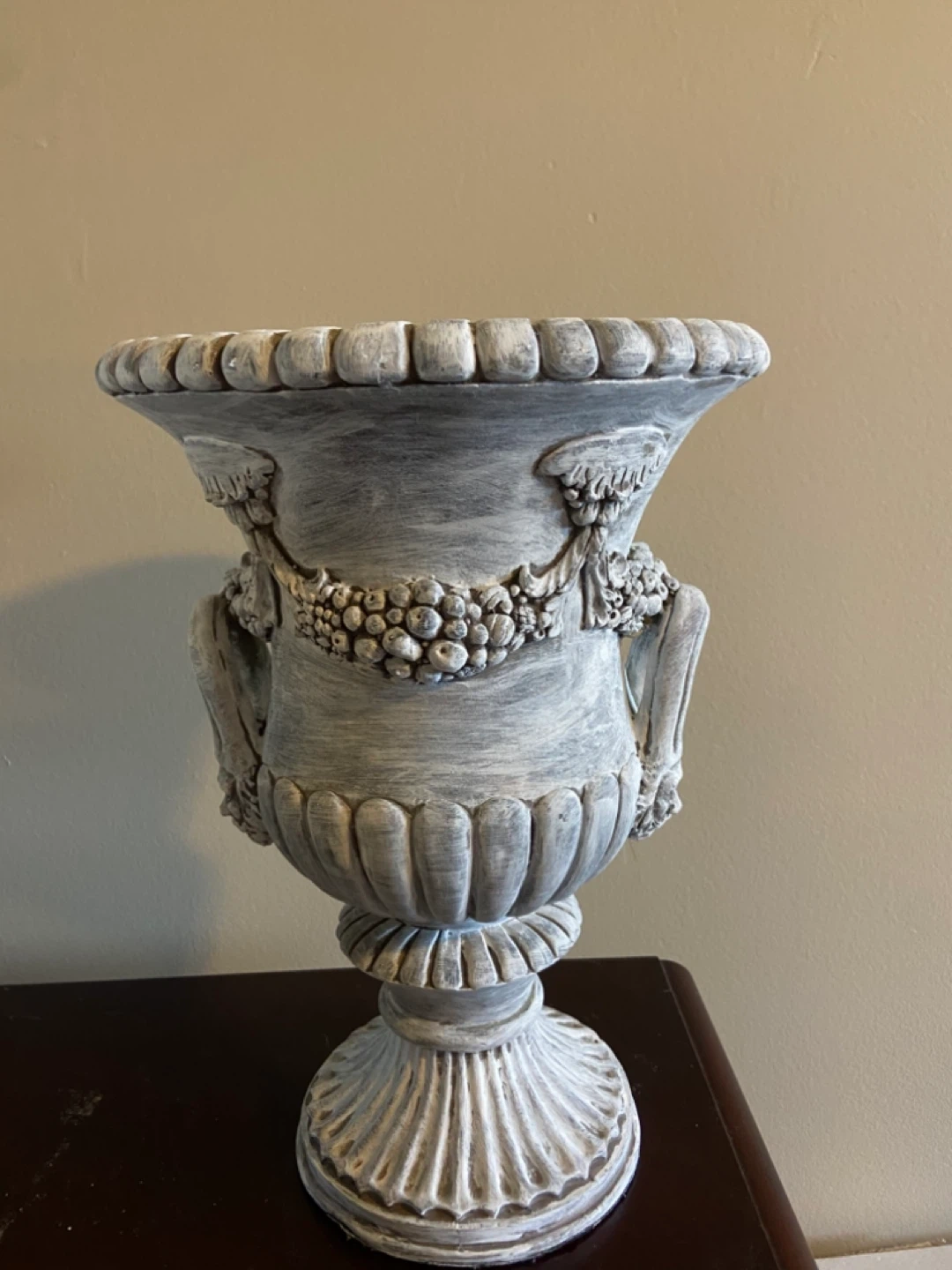 Elegant vintage-inspired urn featuring intricate garland detailing, dual handles, and a beautifully aged whitewashed finish. This piece brings a timeless European/French country feel and works perfectly as a statement accent on a mantle, console table, or entryway.