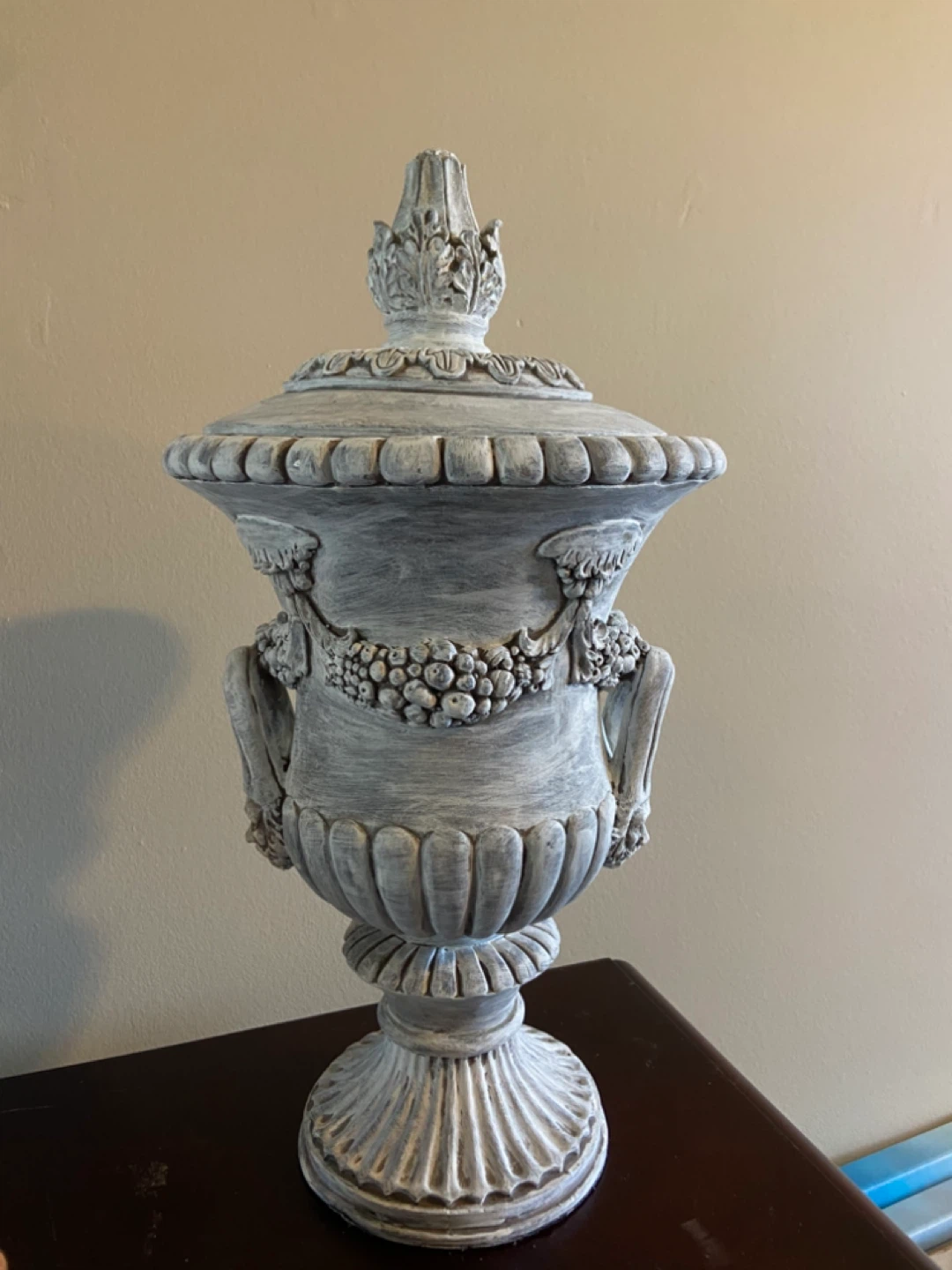 This is a decorative urn with a lid. It has a greyish—distressed finish with sculpted grapevines and handles. It would look lovely on a mantel or as a centrepiece.