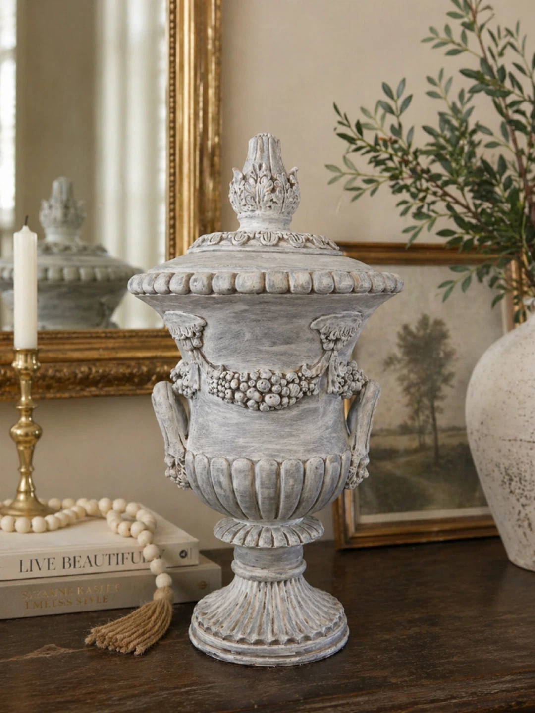 Elegant vintage-inspired urn featuring intricate garland detailing, dual handles, and a beautifully aged whitewashed finish. This piece brings a timeless European/French country feel and works perfectly as a statement accent on a mantle, console table, or entryway.