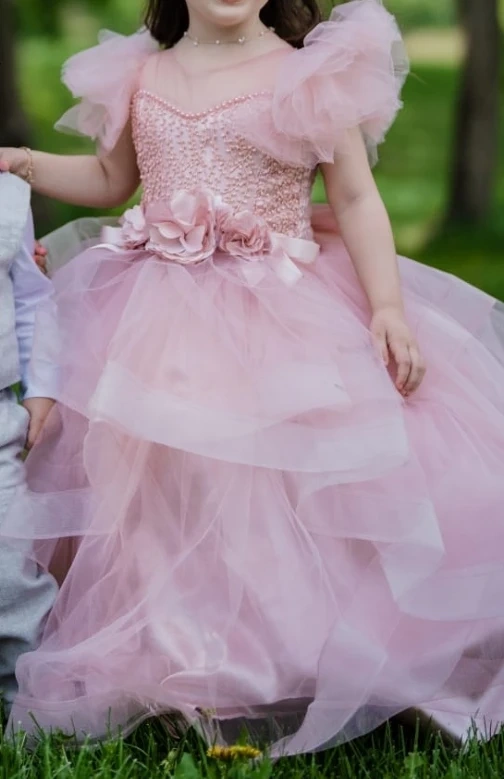 This beautiful pink dress features a beaded bodice and a full tulle skirt with ruffled layers. It's adorned with a satin sash and fabric flowers at the waist. Perfect for special occasions!