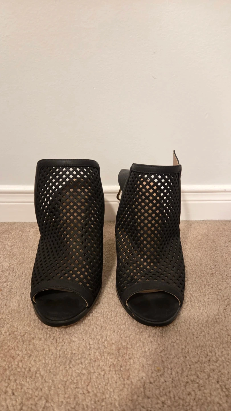 These stylish black heeled sandals feature a trendy mesh design and a peep-toe opening. They have an adjustable ankle strap and a block heel for comfort. Ready for any occasion!