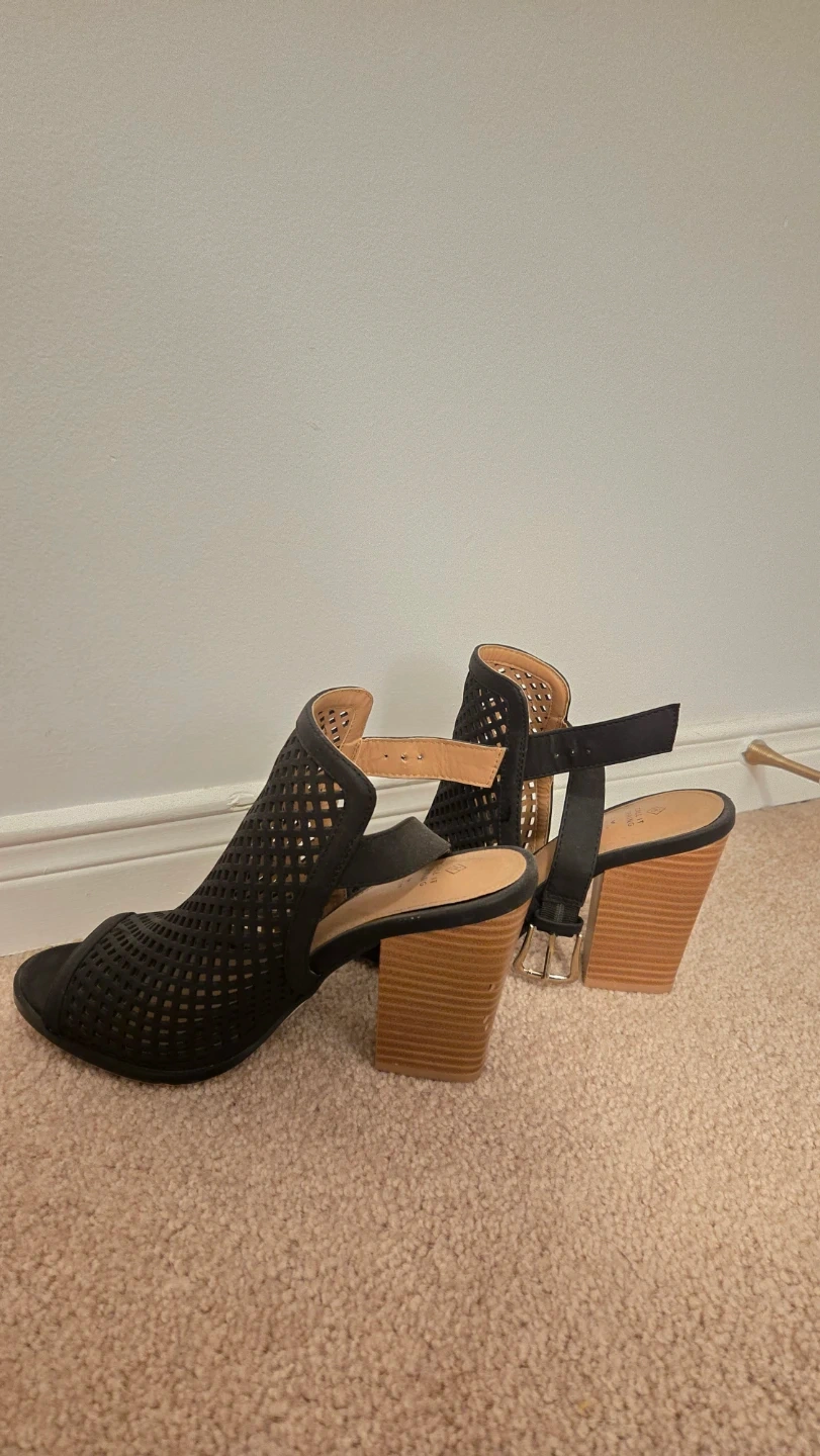 These stylish black heeled sandals feature a trendy mesh design and a peep-toe opening. They have an adjustable ankle strap and a block heel for comfort. Ready for any occasion!
