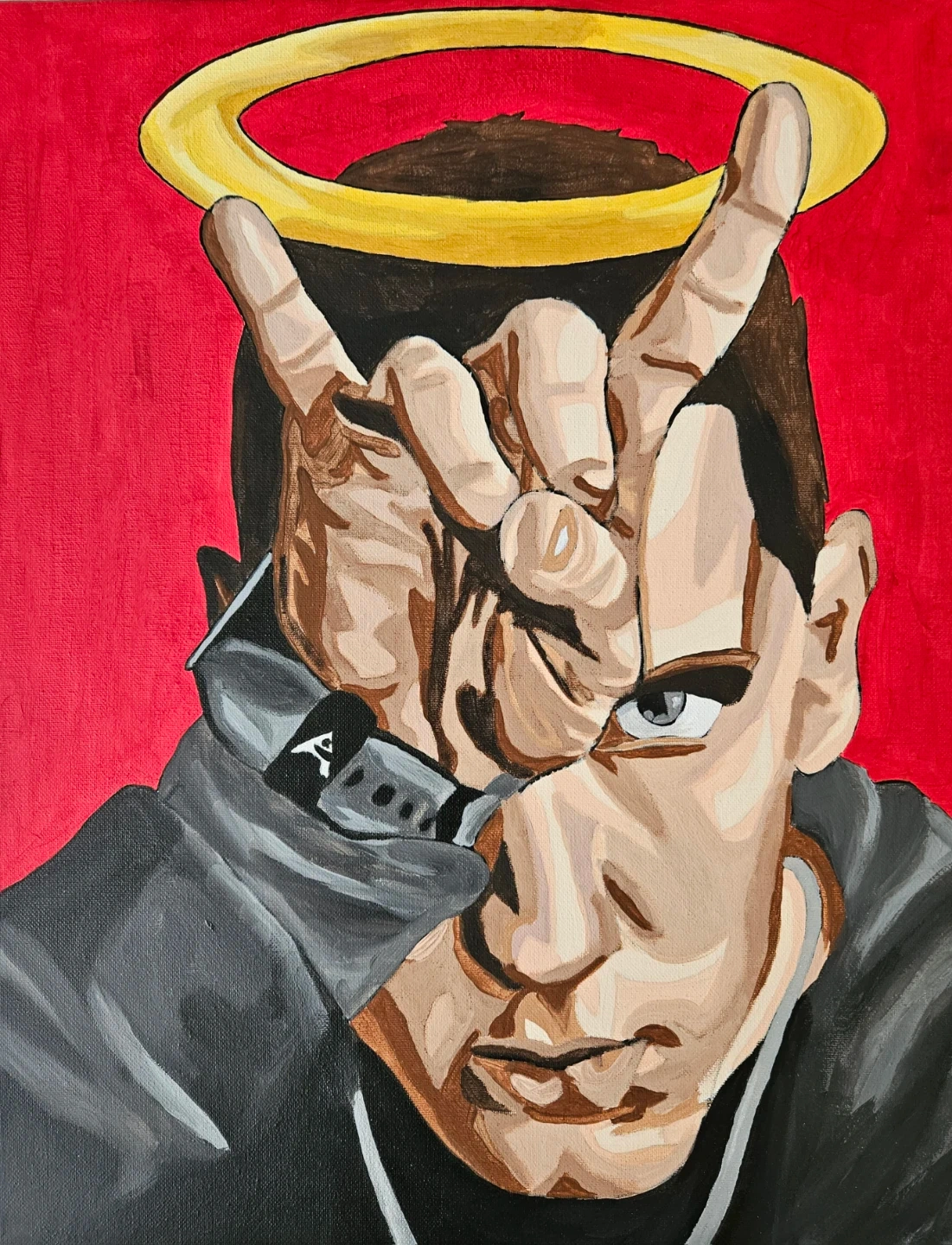 A 16"x20" canvas painting featuring a portrait of Eminem with a halo and a hand gesture. Acrylic paint on stretched canvas. This original artwork is signed. Red background with grey and brown tones for the subject. Artwork for wall display, a must have for every fan.