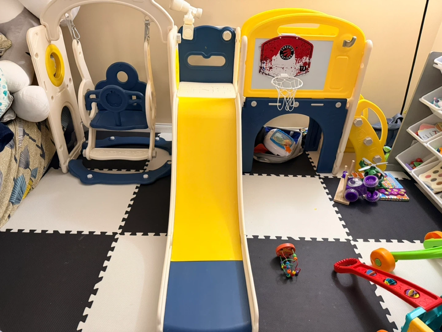 This indoor playground features a swing, slide, and basketball hoop. It's made of durable plastic in blue, yellow, and white. Perfect for toddlers and young children for indoor active play!