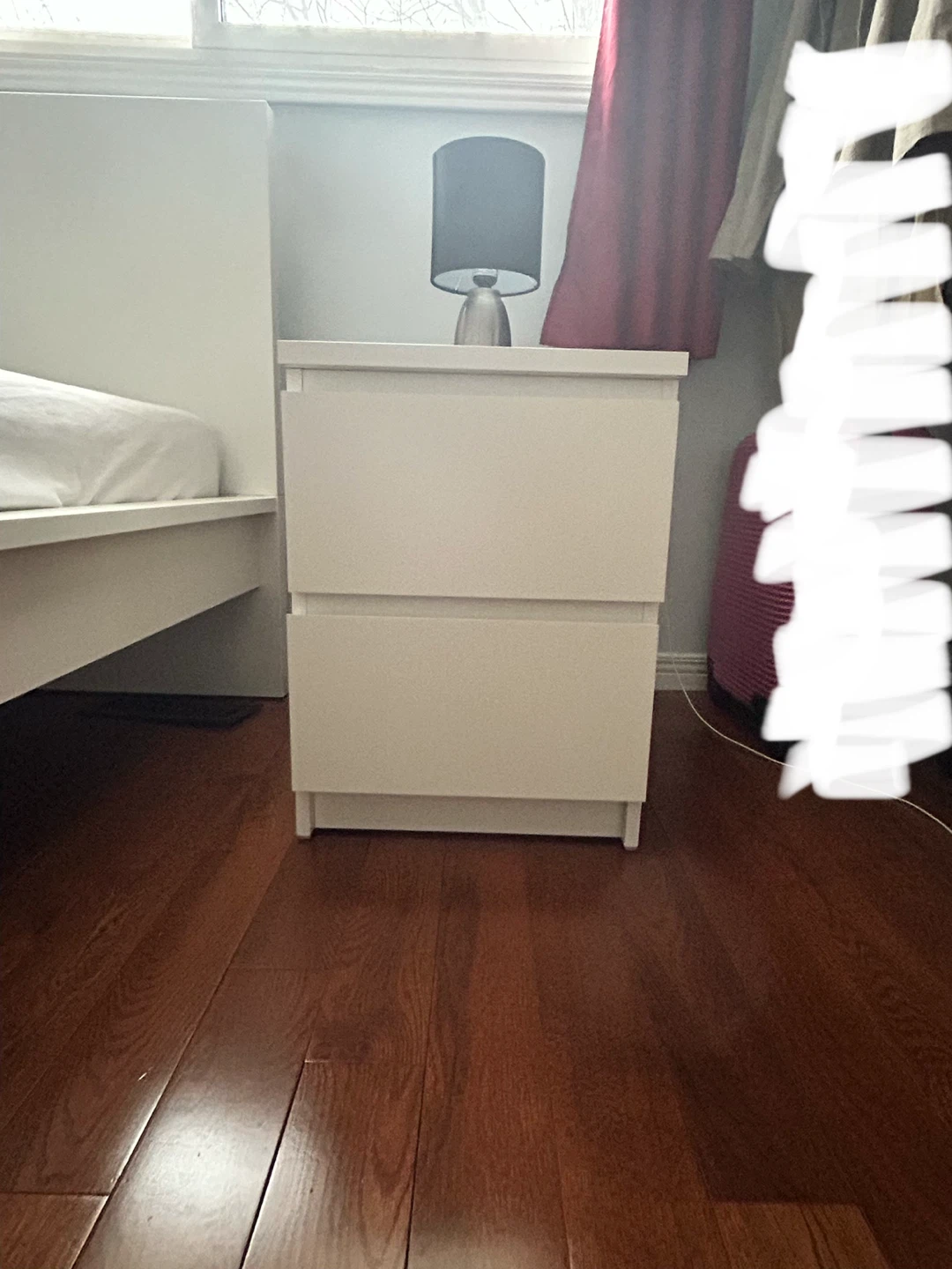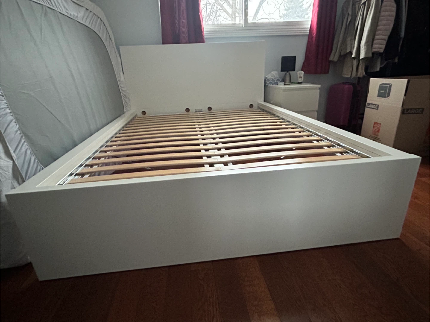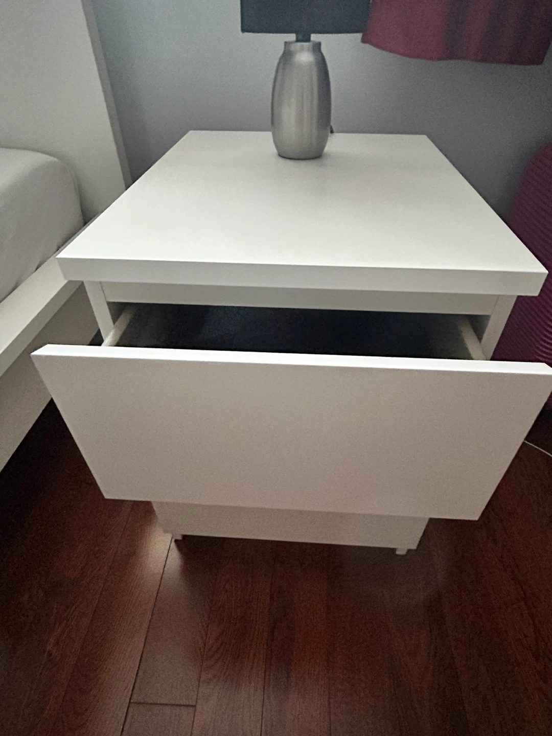White Queen bed frame with a modern headboard. Includes two matching white nightstands, each with drawers for storage. Slatted bed base included.